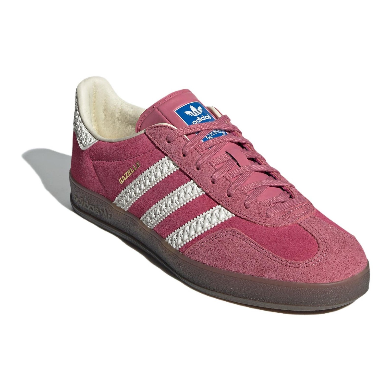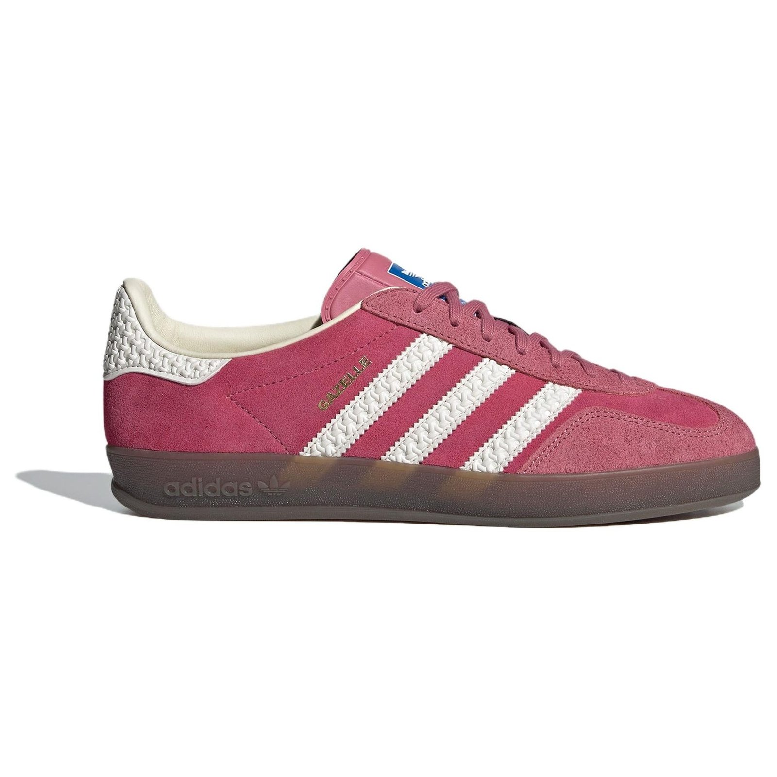 Originally designed as an indoor training shoe, the adidas Gazelle has evolved significantly, with the adidas Gazelle Indoor Pink Cloud White blending retro-inspired elegance with modern comfort and a striking color palette. The Pink Cloud White adidas Gazelle Indoor features a smooth pink suede upper with a tonal fuzzy T-toe overlay and eyestay. The 3-Stripes logo graces the lateral and medial sidewalls in crisp white, boasting an intricate texture that extends to the heel tab, elevating the lifestyle sneaker s design. A gold foil “Gazelle” wordmark embosses the lateral sidewall, while a blue adidas tag sits atop the leather tongue. An off-white textile lining and sockliner decorate the interior, exuding a vintage finish, while a dark gum rubber sole provides traction. This model includes extra white laces for a more personalized style. What our experts love about the adidas Gazelle Indoor Pink Cloud White is the intricate texture on the 3-Stripes and heel tab, which adds depth and contrast against the soft pink suede upper. This model retailed for $120 when it was released.