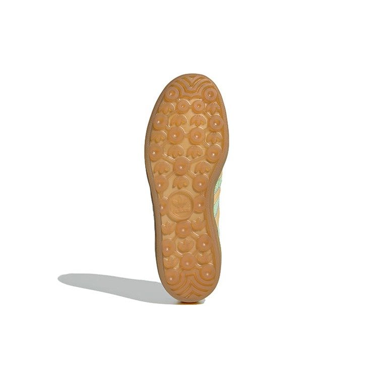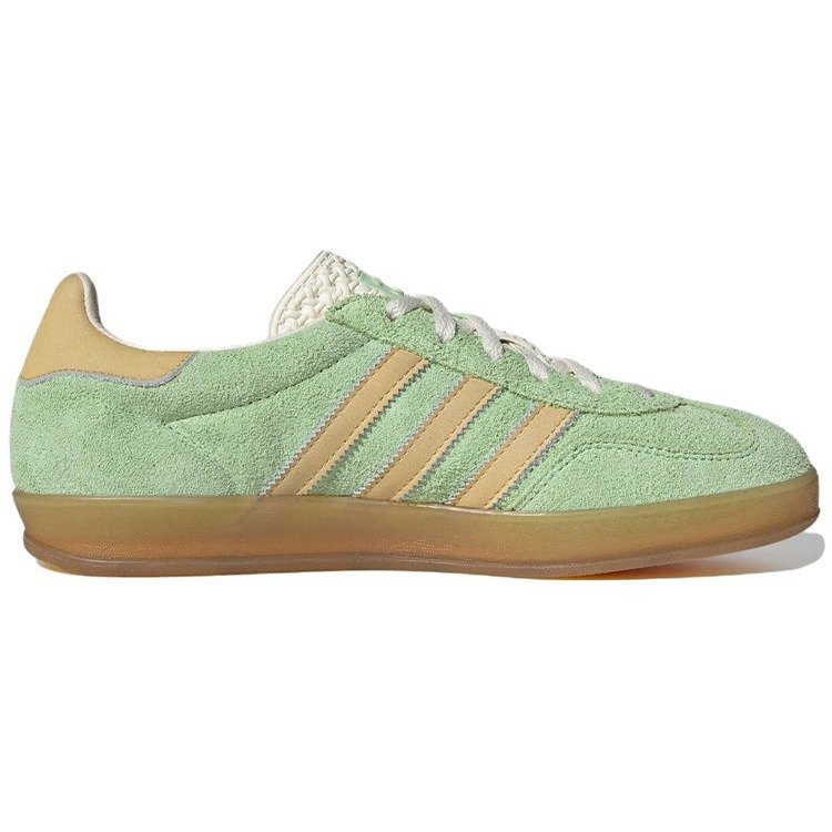 The adidas Gazelle Indoor Semi Green Spark (Womens) is a womens training shoe with a bright springtime colorway. This iteration of the adidas Gazelle Indoor comes with an upper made of light Semi Green Spark suede. The same color of suede also forms the t-shaped toe cap so the difference between the two layers is subtle. The three stripes that are synonymous with the adidas brand run down each side of the shoe in off-white leather, while the same color of leather forms the heel collar. The Gazelle model name appears on the lateral side in Almost Yellow stitching. The white tongue is perforated for breathability and contains an adidas logo patch. The shoe sits on top of a classic branded gum rubber outsole. What we like most about this sneaker is the bright colorway, which allows the shoe to stand out during spring. The adidas Gazelle Indoor Semi Green Spark (Womens) was released on December 24, 2023, for $120.