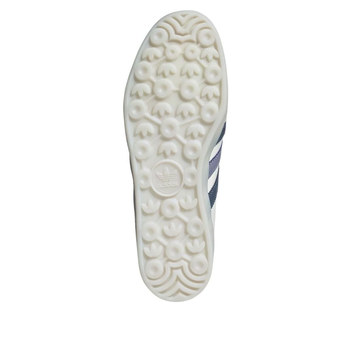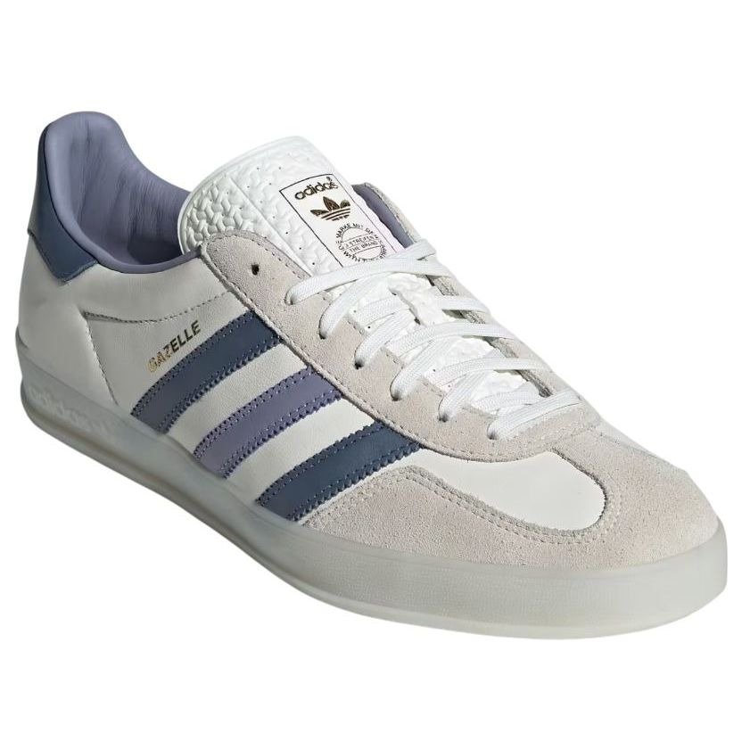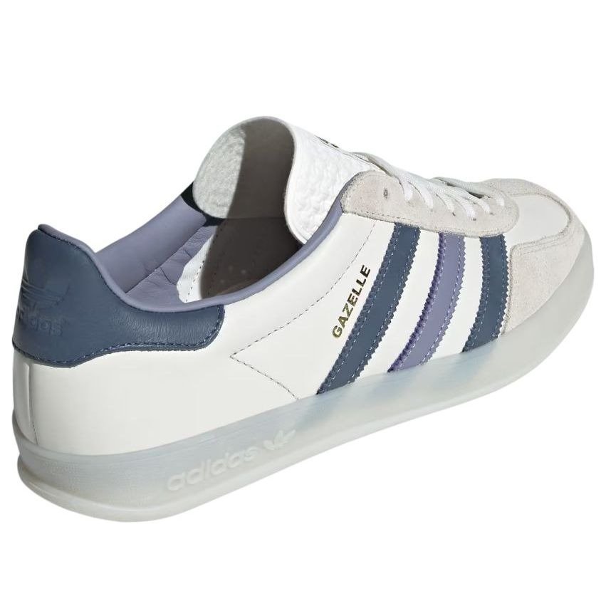 The adidas Gazelle Indoor White Preloved Ink is an indoor soccer shoe that has transformed into a popular lifestyle shoe over its 30+ years of being on the market. This iteration of the adidas Gazelle Indoor has a white leather upper as its base. A small toe cap in a T shape appears in off-white suede, while the eyestays are made of the same material. The adidas 3-Stripes adorn the sides in Preloved Ink colors, including a navy blue and a pale purple. The Gazelle brand name is seen on the outer side next to the stripes in Metallic Gold. A Preloved Ink heel collar bears the adidas trefoil logo, while the white tongue has a patch with gold adidas branding. The branded gum rubber outsole is also a semi-transparent white color. The standout features of this shoe are the metallic gold accents, which complement the white and Preloved Ink colors nicely. The adidas Gazelle Indoor White Preloved Ink was released on April 1, 2024, for $120.