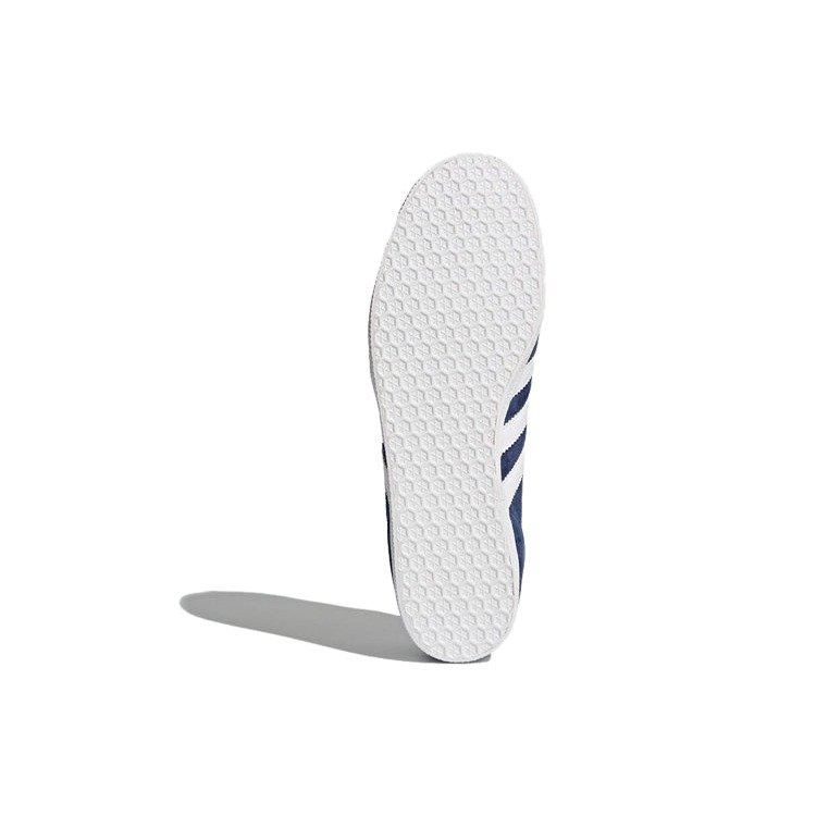 The adidas Gazelle Navy White takes a classic silhouette originally launched as a soccer shoe in 1991 and updates it to enhance style and comfort.The Navy White adidas Gazelle features a navy blue nubuck upper with navy-blue synthetic leather overlays at the toe cap and eyestays. White synthetic leather forms the signature adidas side-panel serrated three stripes, as well as the heel tab with navy-blue adidas trefoil branding. Navy-blue laces crisscross over a white tongue that also sports navy-blue adidas trefoil branding. A white sock liner surrounds a white OrthoLite insole designed for supreme comfort and featuring adidas branding. Gazelle branding in gold script appears above the top lateral side-panel stripe.What we enjoy most about this easygoing, eye-catching lifestyle shoe is the classic sole. A white pebbled EVA foam midsole rests on a white rubber outsole with a consistent pattern designed to absorb impact and provide traction. The adidas Gazelle Navy White was released on January 1, 2018, for $100 retail.