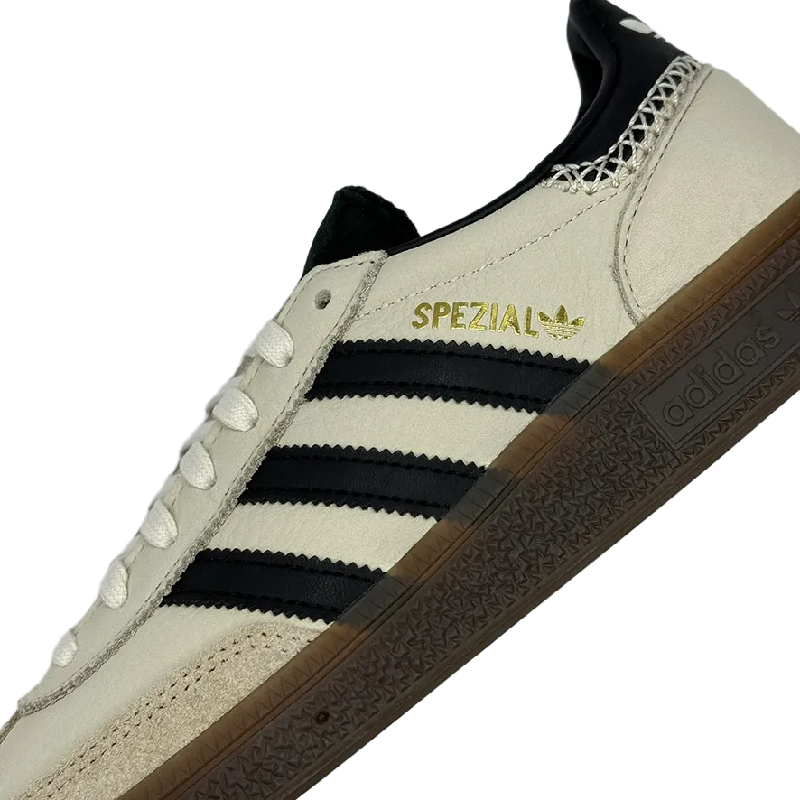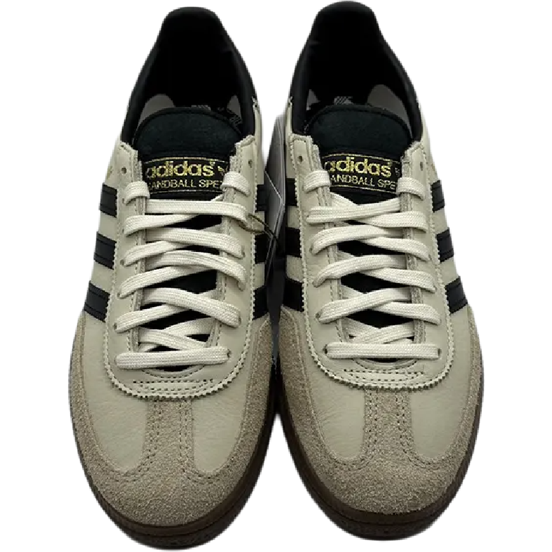 The Handball Spezial is a retro-inspired lifestyle sneaker that was first created as an indoor court shoe. Premium leather in Wonder White with black accents is used to create the upper. For instance, the tongue, collar, heel tab, and side panel all have black 3-Stripes logos. The “Wonder White Black” version differs from other models in that it has a T-shaped toebox composed of Magic Beige soft suede. Details of the branding include a Wonder White trefoil on the heel tab and the word “SPEZIAL” in metallic gold lettering on the side panel.