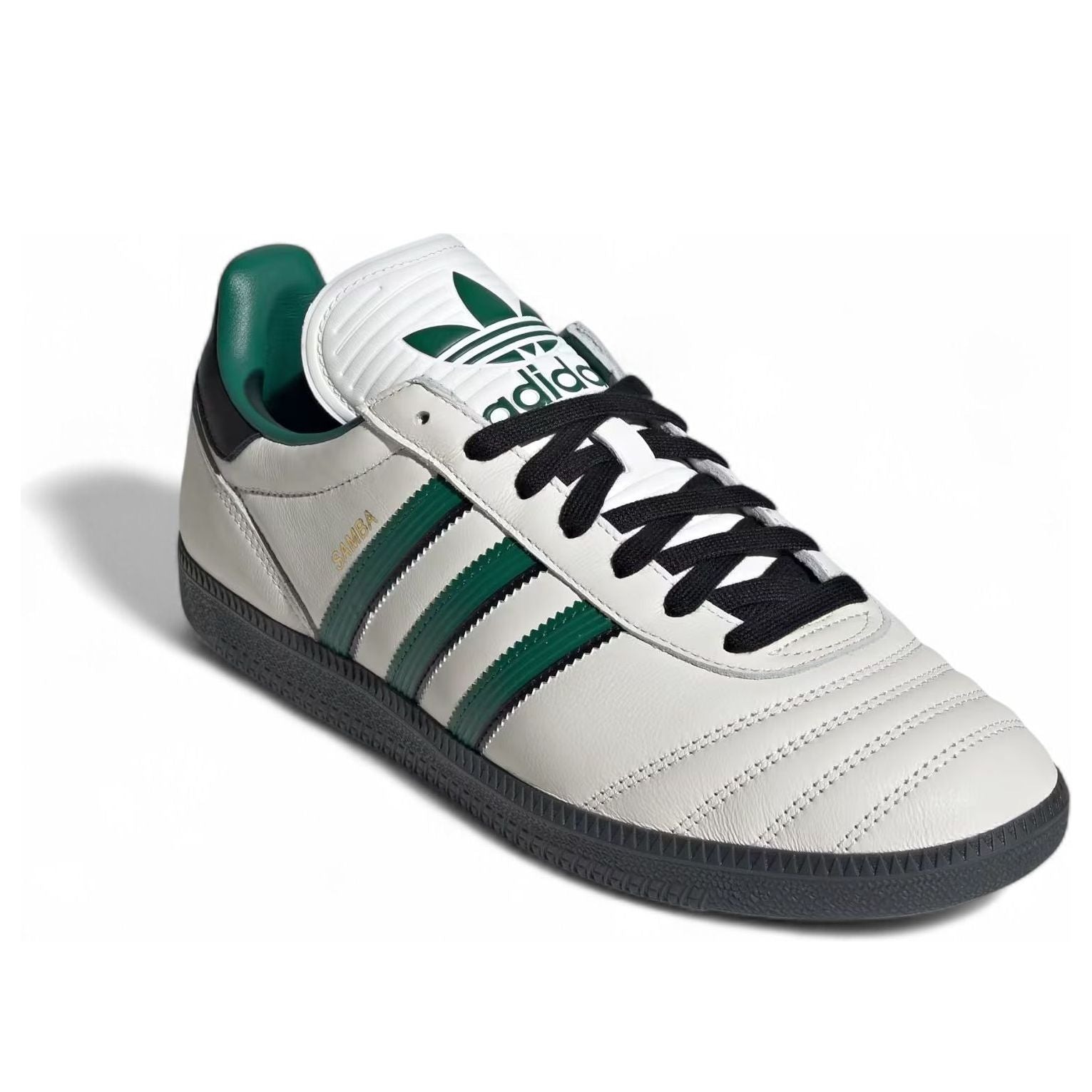 The adidas Samba JP White Collegiate Green Carbon features a Core White/Collegiate Green/Carbon colorway. This adidas Samba JP was first released for $100 on July 01, 2025.