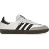 The Cloud White Core Black adidas Samba OG (Women’s) upper is made of full-grain leather and has a robust structure. A black heel tab contrasted with gray suede gives a sophisticated touch to the entire ensemble. The lateral and medial sides are covered in black with the recognizable serrated 3-Stripes, which contrast sharply. A foil logotype and a Bluebird tongue label highlight the shoe’s individual identity and identify its unique DNA. Underneath, a brown gum rubber outsole ensures both traction and durability, accentuating the shoe’s usefulness and appeal.