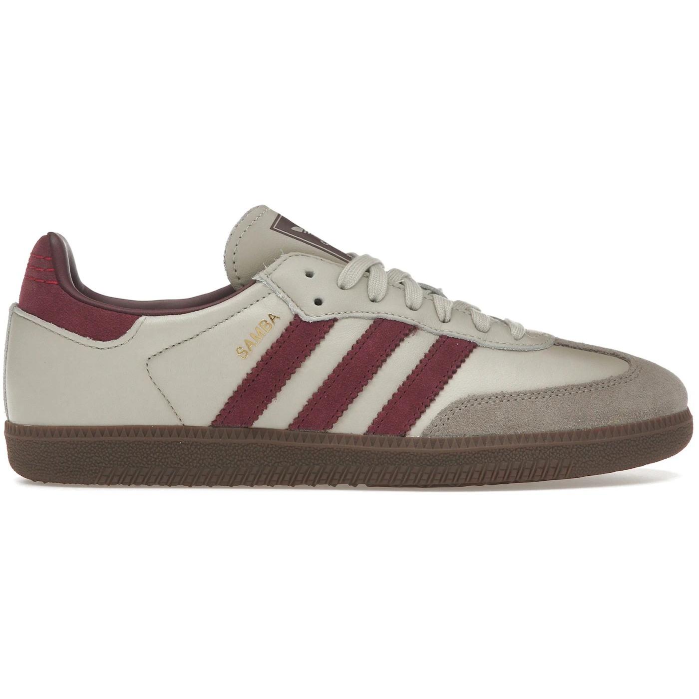 The adidas Samba OG Putty Gray Maroon is an athletic shoe with a neutral colorway. This iteration of the adidas Samba OG has an upper made of calf leather in a Cream color as its base. This smooth leather forms most of the shoe s body, including the sides, heel, and ankle. A hairy suede toecap appears in Putty Gray, while Maroon stripes appear on the sides as adidas branding. The heel collar is also made of Maroon suede and contains three stitched lines. The Samba brand name also appears on the lateral side in gold letters. The tongue contains an adidas branding patch, and the shoe sits on a gum rubber outsole. What we think stands out about this shoe are the maroon accents, which add some vibrance to the otherwise neutral shoe. The adidas Samba OG Putty Gray Maroon was released on October 29, 2024, and retailed for $100.