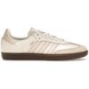 Without detracting from the traditional Samba OG design, the dark gum color contrasts with the light pink Wonder Quartz. The sneaker feels high-end because the entire upper is made of soft leather. Wonder Quartz is on the serrated 3-Stripes, while the base is Cloud White. The light tan tone of the T-shaped toebox overlay and the heel tab goes well with the other hues.