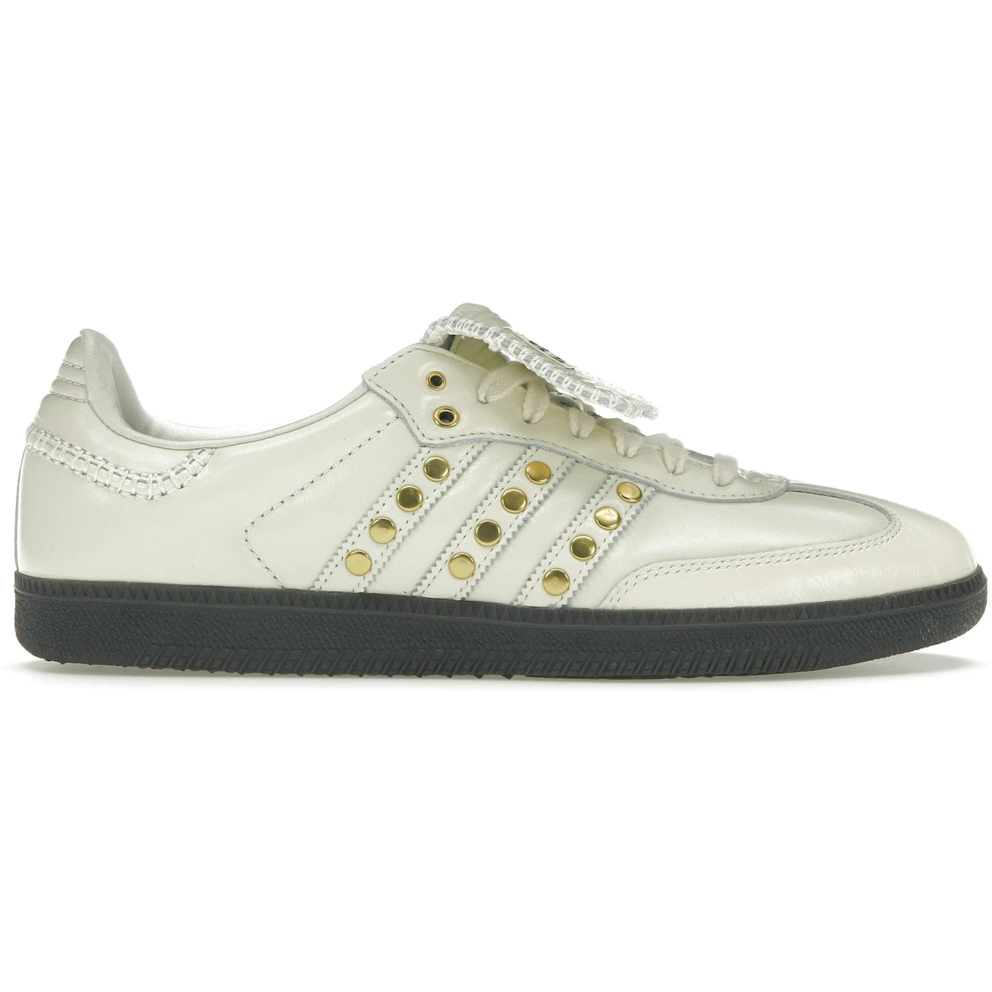 The adidas Samba Wales Bonner Studded Pack Cream White is a unique collaboration between the renowned British-Jamaican designer Wales Bonner and the iconic sportswear brand adidas. This limited-edition sneaker reimagines the classic Samba silhouette with a luxurious twist, featuring premium materials and distinctive design elements.The Wales Bonner Studded Pack Cream White Samba by adidas redefines classic sportswear through premium leather uppers with hand-stitched details and metallic studs. Rather than a suede toe cap, the upper is leather with minimal branding apart from 1/750 printed on the tongue and adidas branding on the inside. Wales Bonner s partnership with adidas highlights a shared commitment to merging tradition with forward-thinking design.One thing we, the experts, love about the adidas Samba Wales Bonner Studded Pack Cream White is the quirky hand-stitched elements that add depth and texture, the metallic studs, and the 3-Stripes for an extra edge. Released on February 9, 2024, it retailed at $280.