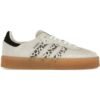 The upper of this adidas Sambae model is made of off-white suede. The t-shaped toe cap and eyestays are made of hairy off-white suede in a lighter cream hue, and the adidas three stripes, which are affixed to the side panels with ornamental white stitching, adorn each side in leopard print. On the lateral side, above the first stripe, the Samba brand name is displayed in black. There is a black adidas logo patch on the tongue and a black heel collar. The thick gum rubber midsole gives the design a chunky feel.