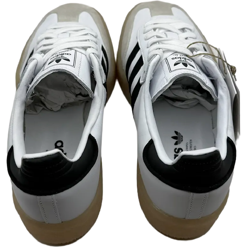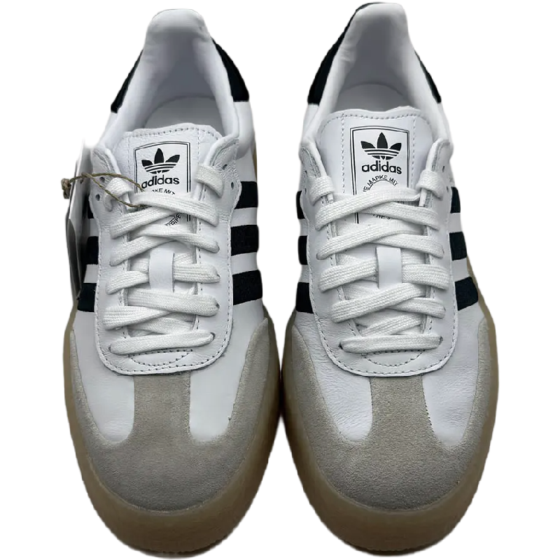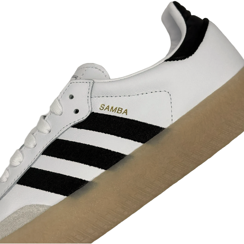 The Women’s adidas Sambae in the White Black Gum colorway has a smooth white nubuck leather upper with an off-white suede T-toe overlay stitched into the forefoot. Both the heel and the side panel’s iconic adidas three stripes are made of textured black embroidery. The white leather tongue and the white textile insole are adorned with the adidas trefoil. Just above the third side panel stripe is the gold scripted Samba branding.