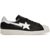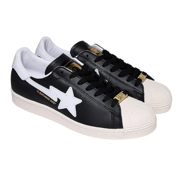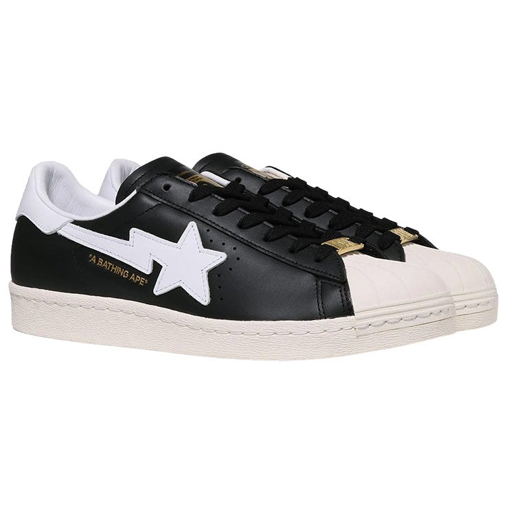 The adidas Superstar 80s Bape Black White Gold (2022) represents an elegant, high-end collaboration between the iconic German sneaker company and the celebrated silhouette from the Japanese streetwear fashion powerhouse A Bathing Ape.This low-top collab features an upper with premium smooth black leather and a white rubber toe cap that adds iconic style as well as support. The outer side features the classic Bape Sta shooting star in white leather, while the middle sports the iconic adidas serrated 3-Stripes in white leather. Black embroidered adidas trefoil branding hits the left white leather heel tab, and Bape Sta branding hits the right. A gold Bape lace jewel is affixed at the bottom of the laces. The vintage-looking sole unit features a classic herringbone traction pattern.The features of this pair of collab kicks that we most enjoy are the tongue tags with their dual branding. Specifically, the right tongue tag with its A Bathing Ape logo paired with the adidas motto printed in French. The adidas Superstar 80s Bape Black White Gold (2022) was released on February 27, 2021, for $150 retail.