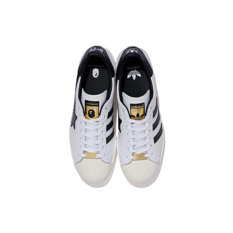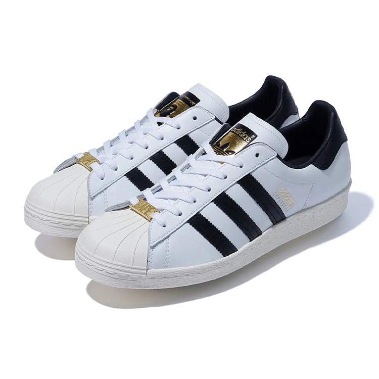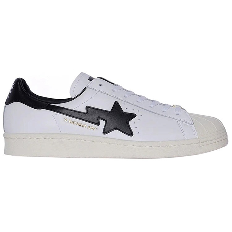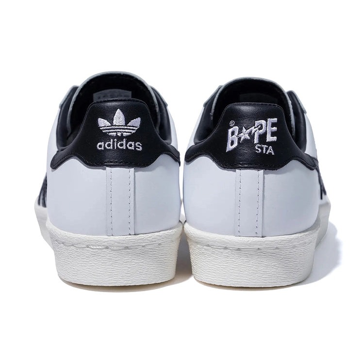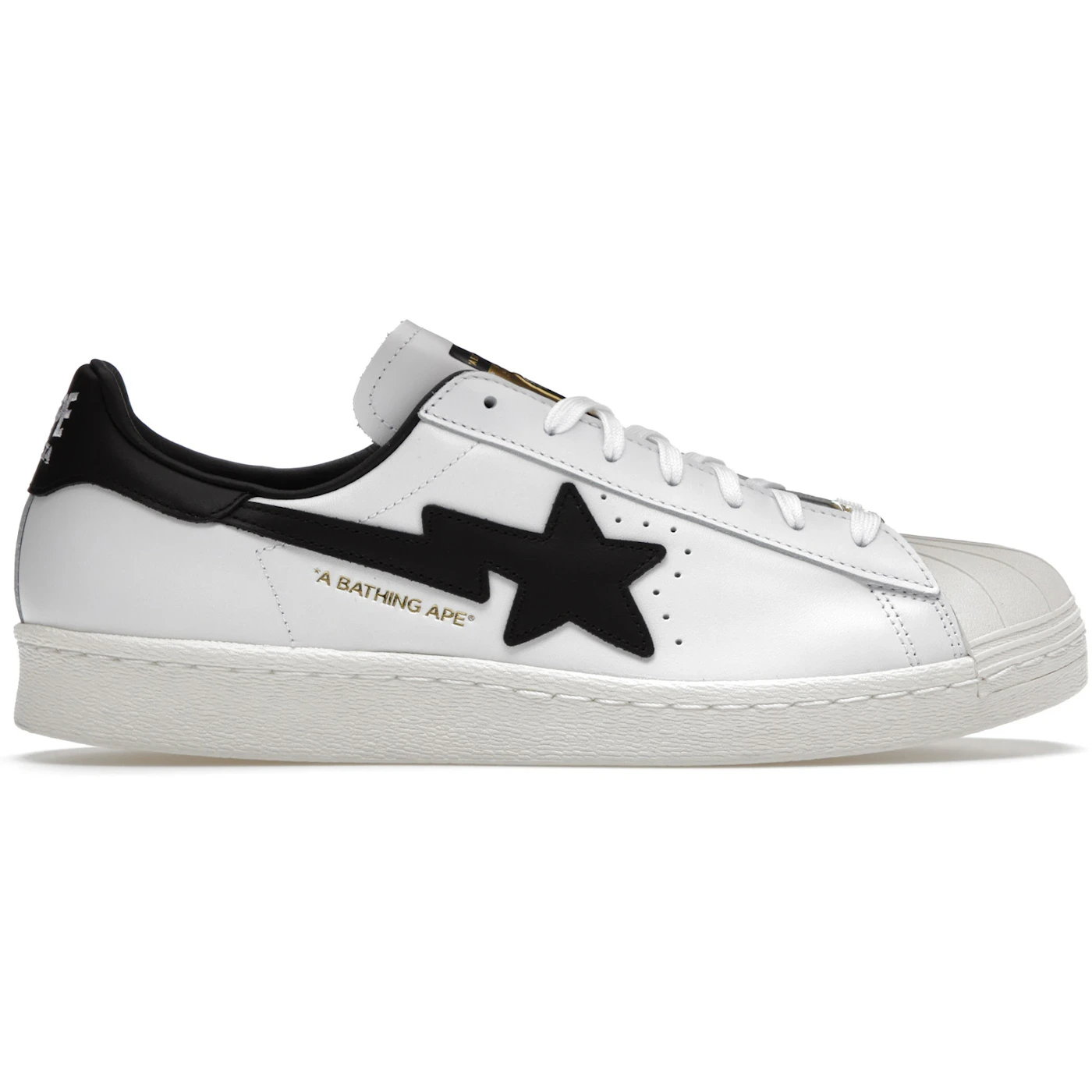The adidas Superstar 80s Bape White Black is an all-white shoe with the Superstar logo, done in black. The shoe has a star on one side whereas the other hosts the iconic 3-Stripes adidas logo. The adidas Superstar 80s Bape White Black is available in several colorways, including black and white. The Bape White Black adidas Superstar 80s has its upper part made from leather. The adidas Superstar 80s Bape White Black debuted on the market on the 27th of February, 2021. At the time, the shoe was selling at a retail price of $150.