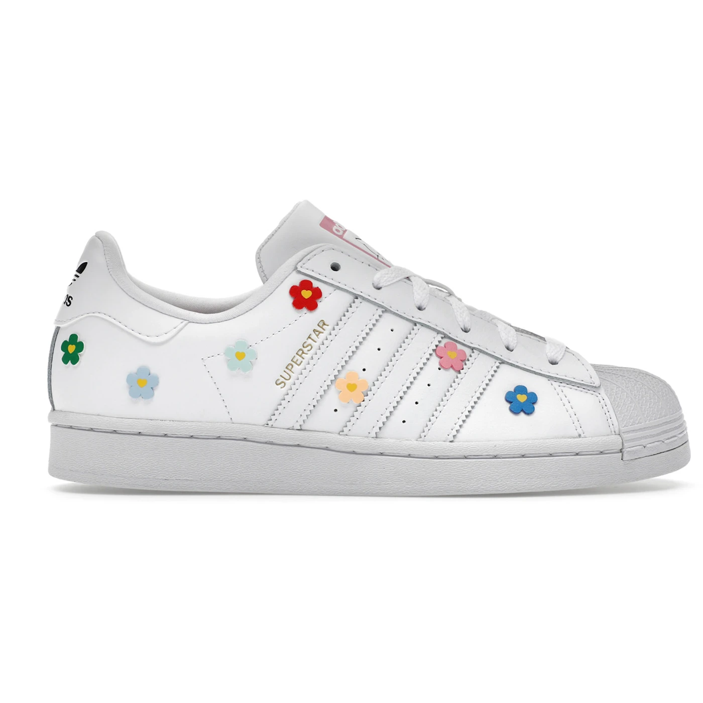 The adidas Superstar Hello Kitty Flowers (GS) features a Cloud White/Cloud White/Core Black colorway. This adidas Superstar was first released for $90 on October 01, 2023.