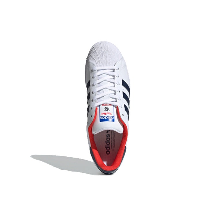 The adidas Superstar Top Ten features a Cloud White/Collegiate Navy/Red colorway. This adidas Superstar was first released for $80 on February 13, 2020.