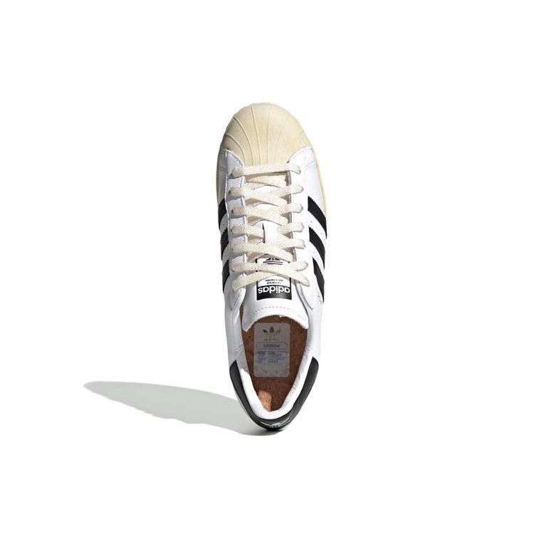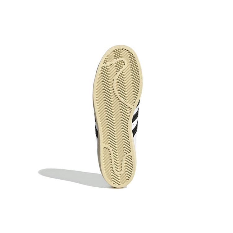The adidas Superstar White Black Aged Sole replicates its OG silhouette in a Cloud White, Core Black and Vintage Brown scheme of colors. This sneaker upper is dressed in a tonal Cloud White base with accents of black on the medial section and heel, and a vintage colored underfoot. This sneaker, which adheres to the conventional low-top style, has a round toe profile with lace closure and the trademark three-stripe decoration to the side. Other branding elements are enhanced by the golden SUPERSTAR logo on the side panels and adidas branding located at the heel tab and atop the tongue. Elsewhere, the matching shell-toe and sole unit, in a Brown Vintage color, completes the shoe. Something that we love about the shoe is the maintained low-top style of the original adidas sneaker. The design portrays the overall uniqueness of the shoe, giving the wearer an authentic OG look. Moreover, the perforations on the side, in between the 3-stripes markings, allow for breathability and a comfortable feel. The adidas Superstar White Black Aged Sole was released on January 1st, 2022, and retailed at a price of $80.