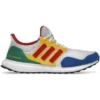 The adidas Ultra Boost DNA Lego Multi is a collaborative sneaker from the adidas x Lego collection.This iteration of the Ultra Boost DNA features a Primeknit upper with a “Cloud White” base and Shock Blue overlays on the toe and Green heel counter. Collaborative details include adidas x Lego branding on the tongue tag and insole, Lego s red and yellow accents, and a lace cage with Lego-themed Yellow and Red 3-Stripes. This shoe maintains the traditional ultra boost branding on the lateral heel. A White Boost midsole rests on a Black rubber outsole.The adidas Ultra Boost DNA Lego Multi was released on June 16th, 2021, it retailed at $200.