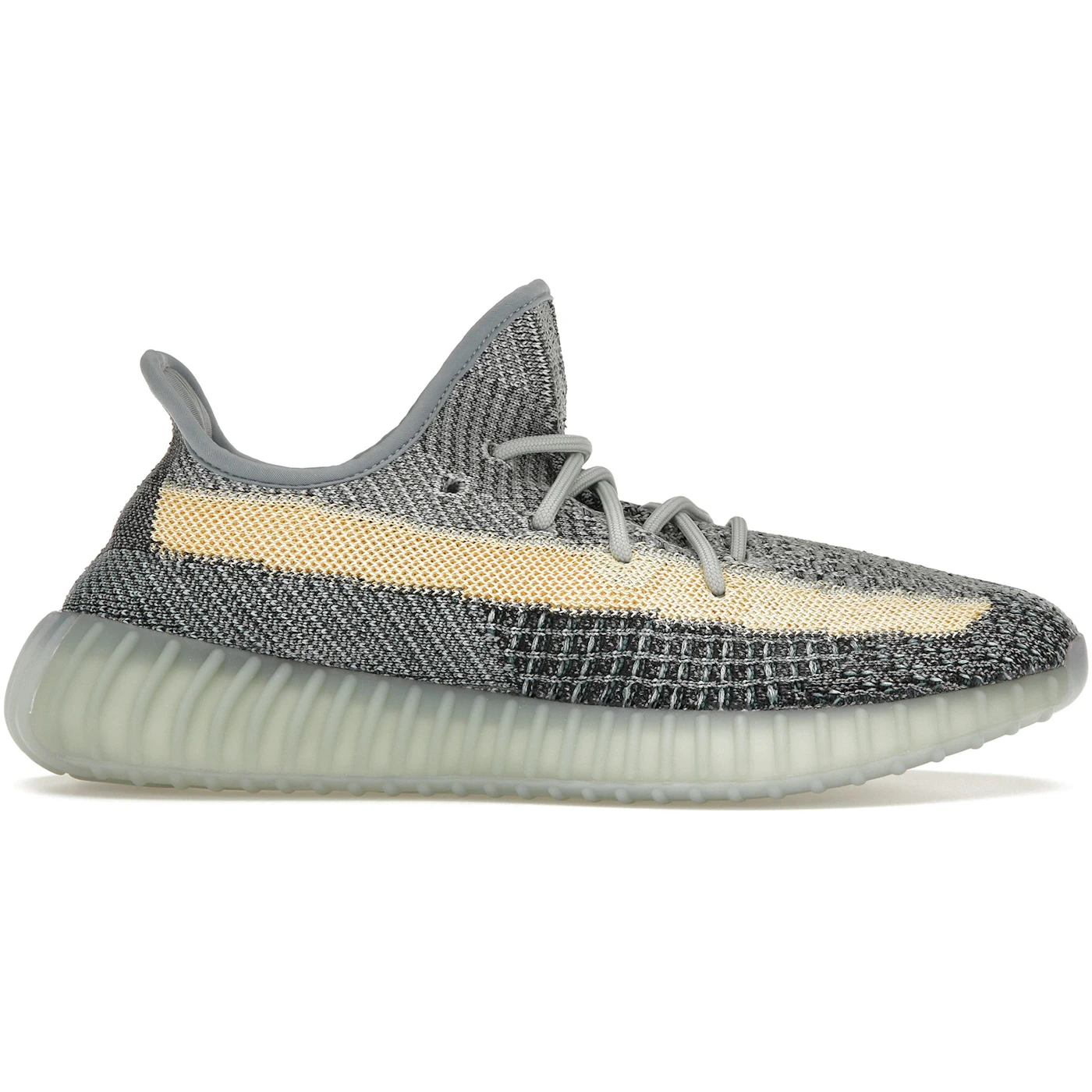 The adidas Yeezy Boost 350 V2 Ash Blue features an engineered primeknit upper that blends blue, black, and gray fiber. adidas Yeezy Boost 350 V2 Ash Blue also features a yellow hue that distinguishes the post-dyed monofilament side strip embroidered on the shoe s side panel. The yellow hue offers a pop of color to the shoe. It also features a sock-like upper that rides on a full-length Boost Midsole. The sock upper is wrapped up in a semitranslucent rubber cage that adds stability and durability to the shoe. adidas Yeezy Boost 350 V2 Ash Blue was released in February 2021 at a retail price of $220.