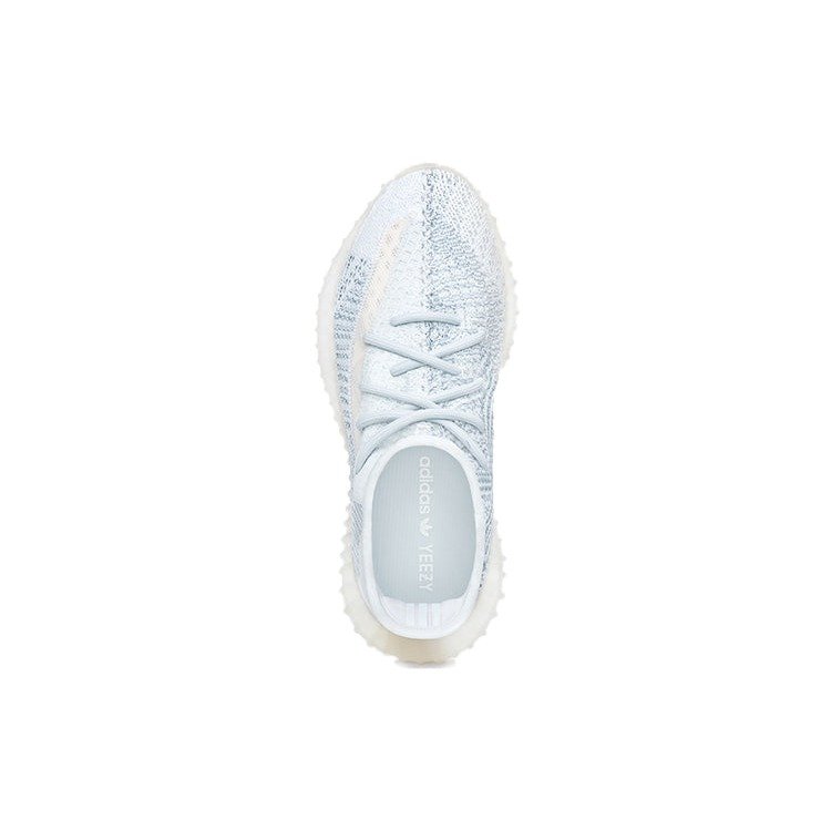 The adidas Yeezy Boost 350 V2 Cloud White (Non-Reflective) combines shades of cream and bluish-white to recreate the hue of a fluffy cloud. A hard sole offers a contrast to the elastic shoelaces and knitted fabric upper. Instead of separate overlays, the upper has the appearance of a single stitched-together piece. One side of the sneaker offers a transparent strip, and the other highlights the blue-and-white patterns. The adidas Yeezy Boost 350 V2 Cloud White (Non-Reflective) uses Primeknit to create a woven textile appearance.adidas Yeezy Boost 350 V2 Cloud White (Non-Reflective) released in September of 2019 and retailed for $220.