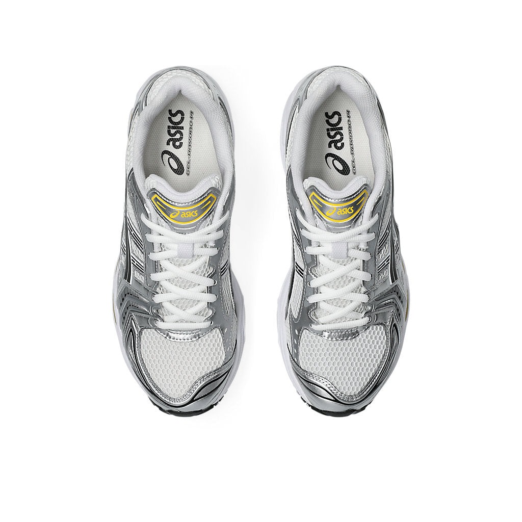This sneaker, designed by Kiko Kostadinov, incorporates design aspects from Toshikazu Kayano’s original Gel-Kayano models. The sneaker has the futuristic appearance of the early 2000s thanks to a web of overlays that crisscross over the side panels. The shoe has new parts and materials, but it retains its vintage tooling. The white mesh upper lets the foot breathe, and the metallic-silver overlays are made of synthetic leather instead of real leather. Parts of the midsole include vivid Tai Chi Yellow accents, and the heel, tongue, and lateral side panel all feature ASICS logo.