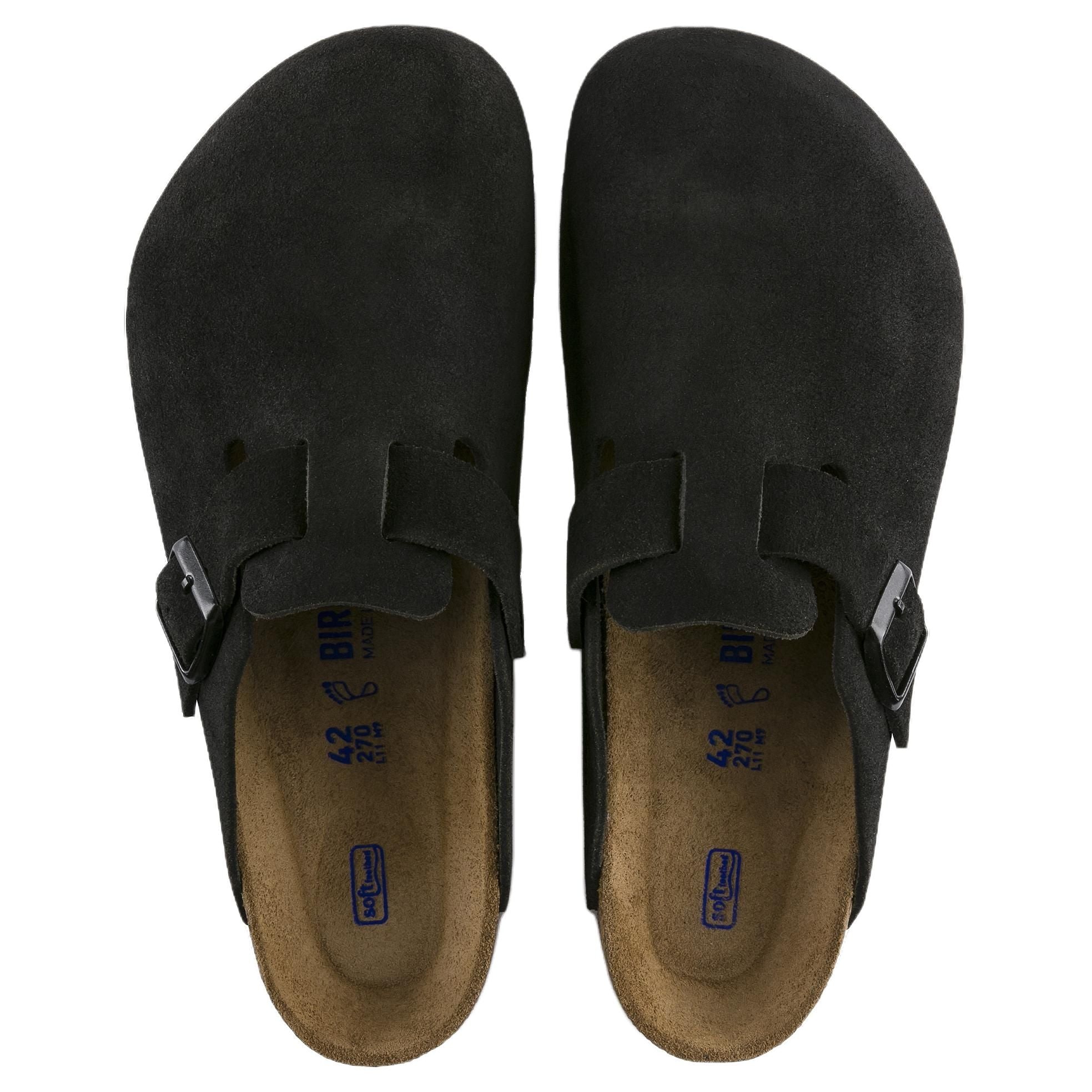 The Birkenstock Boston Soft Footbed Suede Black is a version of the recognizable Birkenstock Boston clog model that comes with an upper and footbed lining made of soft suede.One element that makes this shoe stand out is the inclusion of an additional foam layer in the footbed. This provides additional comfort and reduces the impact caused by walking. The clog comes with an adjustable suede strap, which can be loosened or tightened with a metal buckle. Although the branding elements are minimal, BIRKENSTOCK is embossed on the lateral side, and BIRKENSTOCK can also be found on the metal buckle. The clog boasts an EVA sole that is both flexible and durable.Our experts at Newsole love the contrast between the black sole, the black upper, and the tan-toned footbed. The Birkenstock Boston Soft Footbed Suede Black was released on June 30, 2023, and retailed at $155.