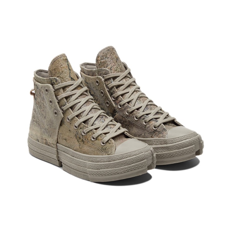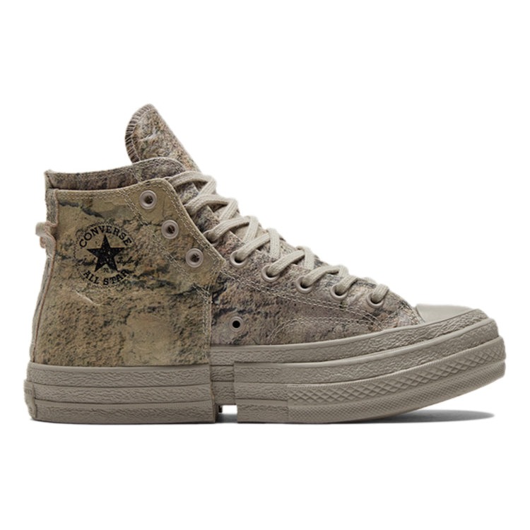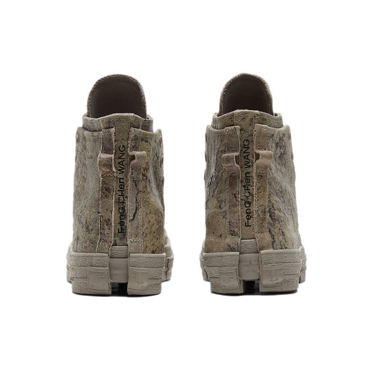 The Converse Chuck Taylor All Star 70s Hi 2-in-1 Feng Chen Wang Grey is a collaborative product by Converse and established Chinese-born menswear designer Feng Chen Wang.An iteration of the iconic Chuck Taylor All Star 70s 2-in-1, one of the duo s first collaborative products, this shoe is doubled-up on the front and the back. Its upper, embellished with a unique graphic print meant to resemble sealed concrete, features grey metallic eyelets, laces, a pull tab, a black Converse Chuck Taylor All Star imprint, and Feng Chen Wang branding vertically printed on the back heel. The Grey Feng Chen Wang Converse Chuck Taylor All Star 70s Hi 2-in-1 rests on a stacked midsole and a rubber outsole. Note that this outsole is split into four quadrants.The design for the Converse Chuck Taylor All Star 70s Hi 2-in-1 Feng Chen Wang Grey is what we love the most about the shoe. The idea for this shoe, released on October 12th, 2021, for $180, was to push structural and cultural limits. Its design achieves this purpose because it creates the illusion of restrictions being shattered.