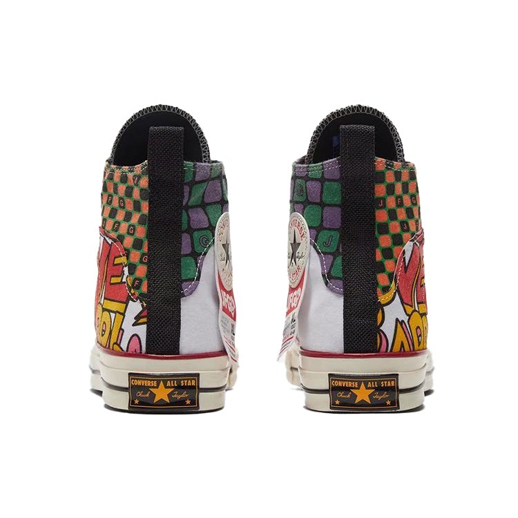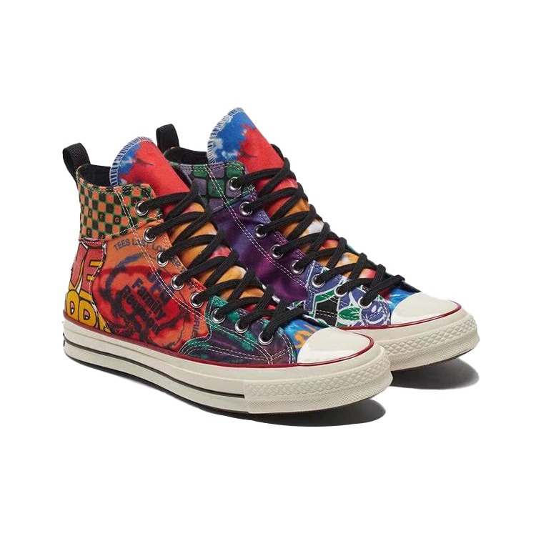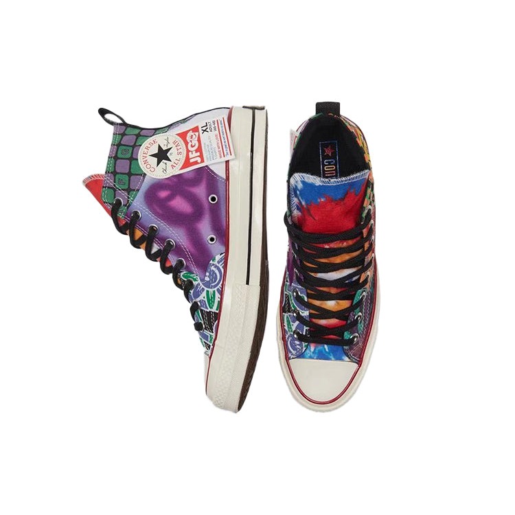 The Converse Chuck Taylor All Star 70s Hi Joe Freshgoods T Shirt is an iteration of the Classic Chuck Taylor 70s, redesigned by Chicago-born streetwear designer and creative director Joe Freshgoods.Like the original Chuck 70s, the Joe Freshgoods Converse Chuck Taylor All Star 70s Hi T Shirt maintains a canvas upper, white midsole with contrasting red and black stripes, and a gum outsole, solidified for sturdiness and enhanced underfoot grip. The difference with this shoe is that its upper is detailed with graphic prints, black laces, a black pull tab on the heel, and a JFG t-shirt tag on the traditional Converse Chuck Taylor All Star Patch.What we appreciate the most about the Converse Chuck Taylor All Star 70s Hi Joe Freshgoods T Shirt are the graphics printed on its upper. Inspired by the t-shirts Joe Freshgoods has worked on both on his own and in collaboration with Converse, the graphics make this shoe stand out. This sneaker was released on December 12th, 2020. At the time, it retailed at $130.