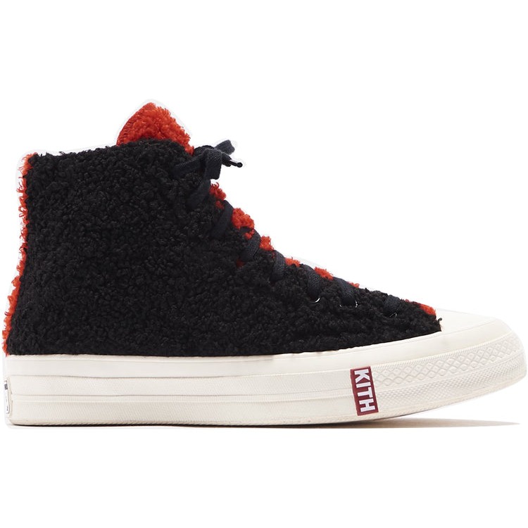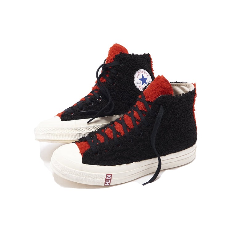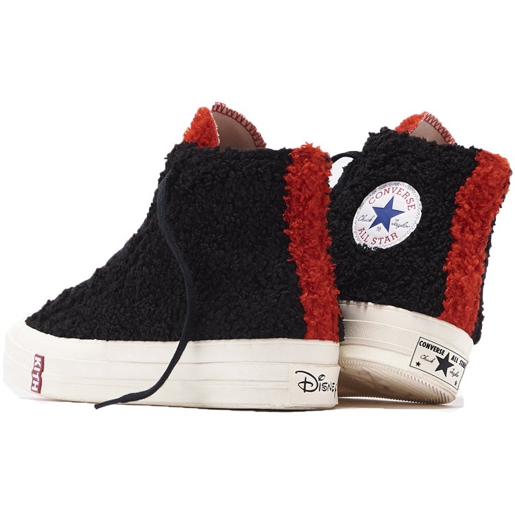 The Converse Chuck Taylor All Star 70s Hi Kith x Disney Fur is a collaborative product by Converse, American fashion and lifestyle brand Kith, and entertainment and media company Disney.This sneaker features high uppers covered with fuzzy black material, contrasted by a red stripe on the heel and a similar colored tongue. The uppers of the Kith x Disney x Converse Chuck Taylor All Star 70s Hi Fur rest on a cream midsole highlighted with a Kith logo appearing near the forefoot and a Converse license plate at the rear. Underfoot, this three-way collaborative product boasts a rubber outsole, vulcanized for traction and durability.The Converse Chuck Taylor All Star 70s Hi Kith x Disney Fur, released to commemorate the 90th birthday of Disney s Mickey Mouse on November 18, 2019, for $140, has a Fur design that is an ode to the big-eared cartoon character s status as one of the most renowned stuffed animal toys of all time. This fur design is what we like the most about the shoe, given that it is unique and stylish.