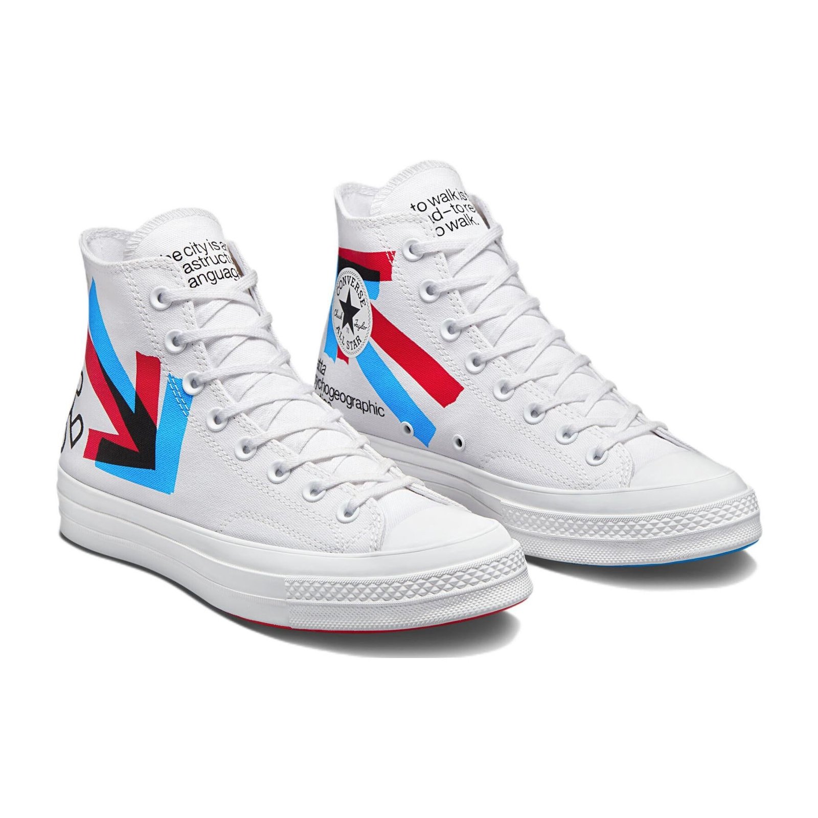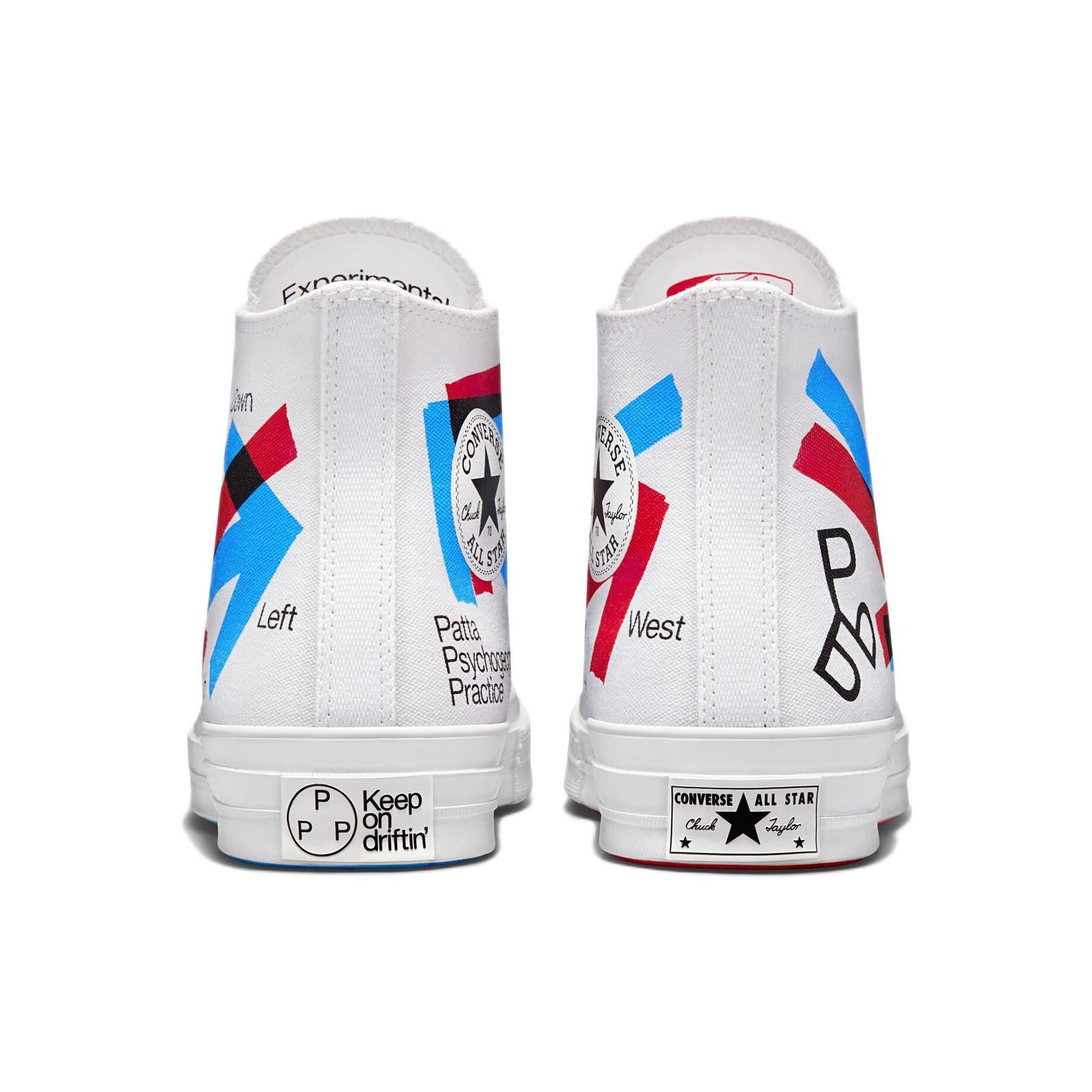 The Converse Chuck Taylor All Star 70 Hi Patta Experimental Jetset is part of a triple collaboration between Converse, Dutch streetwear label Patta, and Amsterdam design studio Experimental Jetset.The Patta Experimental Jetset Converse Chuck Taylor All Star 70 Hi dresses the Chuck 70 in straightforward white canvas with tonal laces and white-metal eyelets. Inspired by exploring urban places, the upper displays overlapping arrow graphics in Fiery Red and Diva Blue. The left and right shoe feature different graphics and lettering on each side. For example, the right shoe s outer side panel showcases “PPP,” while the left shoe s outer side reads “RIGHT DOWN LEFT UP.”Our experts like the co-branded details found throughout the shoe, including the lettering on the tongue. It reads, “to walk is to read to read is to walk.” The Converse Chuck Taylor All Star 70 Hi Patta Experimental Jetset was released on November 10, 2022, and sold for $100.