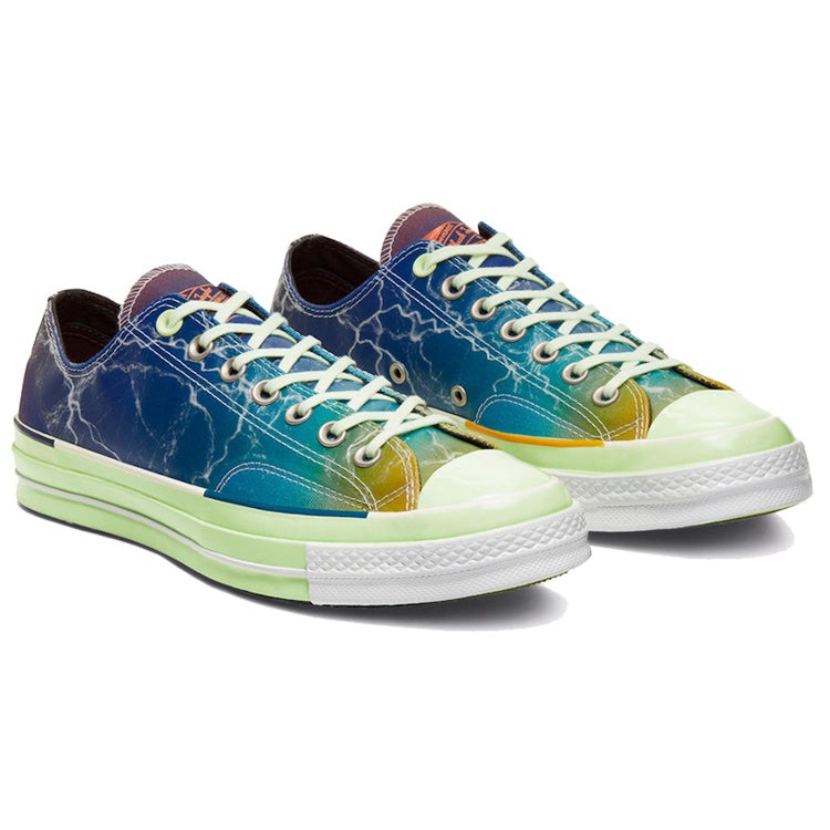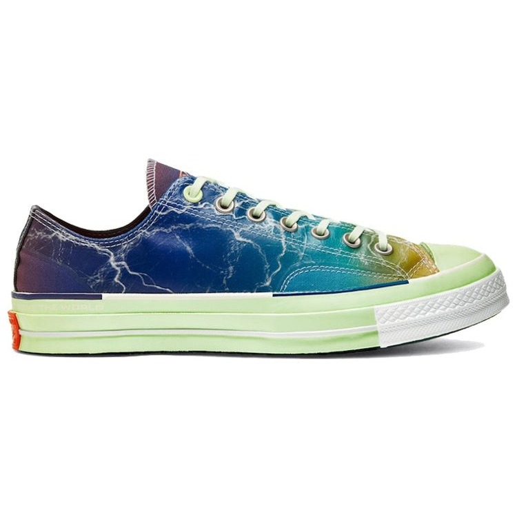 The Converse Chuck Taylor All Star 70s Ox Pigalle Multi is a multi-colored variation of the iconic Converse Chuck Taylor 70 designed by Converse in collaboration with French sportswear brand Pigalle.Like the original, this shoe boasts a canvas upper fused to a rubber toecap, midsole, and outsole. The difference with this variation is that its canvas upper features fused film coating and a striking lightning pattern; the textured midsole is dressed in green with hints of white, and its outsole adorns a colorful gradient. Other details on the Pigalle Multi Converse Chuck Taylor All Star 70s Ox include green laces, metallic eyelets, a bright orange Converse Chuck Taylor All Star logo at the back, and a Converse x Pigalle logo on the tongue.What we love the most about the Converse Chuck Taylor All Star 70s Ox Pigalle Multi is the vibrant graphic it adorns. The graphic makes the shoe, released on January 25th, 2020, for $120, stand out from other colorways.