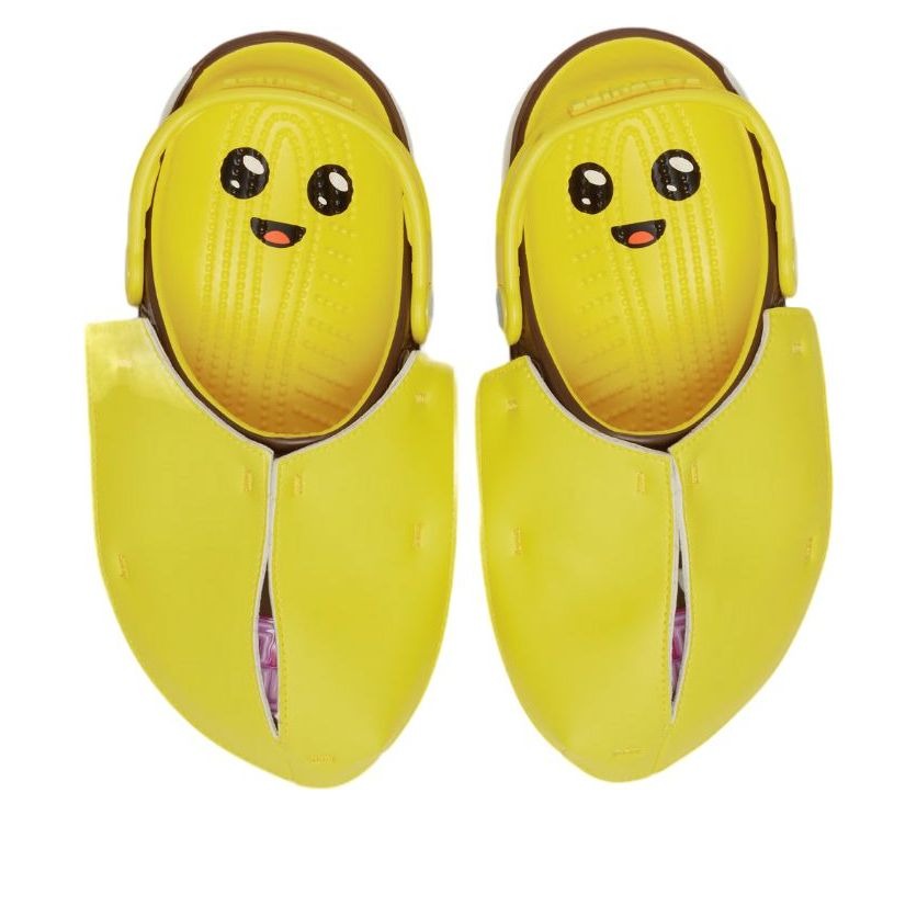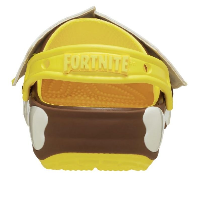 Step into the world of Fortnite with the Crocs Classic Clog Fortnite Peely. This vibrant collaboration brings the beloved banana character Peely to life on Crocs’ iconic silhouette. The bright lemon yellow upper is adorned with Peely’s signature features, including his expressive eyes and mouth, creating a playful and eye-catching design. The brown and tan accents add depth to the overall look, making these clogs stand out in any setting. Crafted with Crocs’ renowned Croslite foam, these clogs offer the perfect blend of comfort and durability. The ventilation ports not only add to the shoe’s distinctive look but also provide breathability and allow for easy cleaning. The pivoting heel strap ensures a secure fit, while the customizable Jibbitz charm holes let wearers personalize their clogs with Fortnite-themed accessories. Whether you’re a die-hard Fortnite fan or simply looking for a fun and comfortable footwear option, these clogs deliver on both style and functionality. Our team thinks this product is great for gamers and Fortnite enthusiasts who want to showcase their passion while enjoying the unmatched comfort of Crocs.