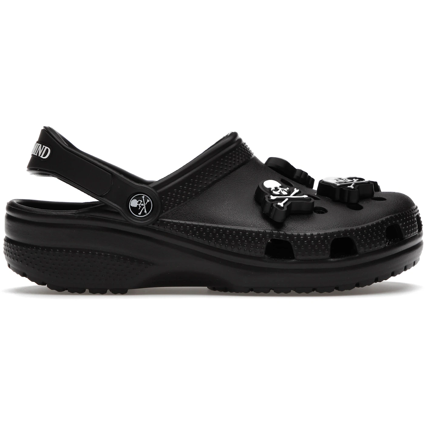 The Crocs Classic Clog Mastermind Black is a classic clog silhouette by Crocs and Mastermind Black. The main material used in the making of the Crocs is the CrosliteTM, and it appears in black and black and white colorways. The famous skull and crossbones design from Mastermind are featured at either ankle strap joint of these all-black shoes. Removable Jibbitz to the front further emphasizes the brand’s instantly recognizable gothic style. At each heel, you’ll also find Crocs’ recognizable Crosslite and stamped branding. The treaded base of the Crocs provides a good grip when walking. Crocs Classic Clog Mastermind Black was first released on July 7, 2022, at a retail price of $70.