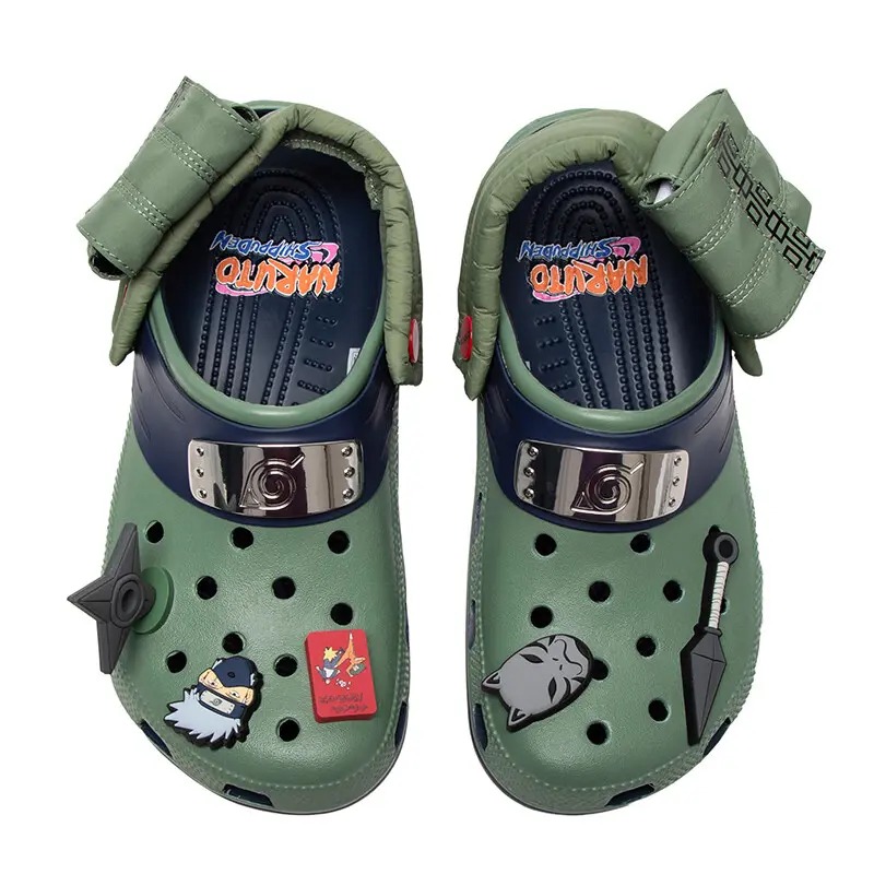 The Crocs Classic Clog Naruto Shippuden Kakashi is part of a collaboration between Crocs and Naruto Shippuden, a Japanese manga and anime series created by Masashi Kishimoto.This slip-on shoe pays tribute to Kakashi Hatake, a ninja and protagonist in the series, through colors and motifs. For example, the clog boasts a green base, which symbolizes Kakashi Hatake s uniform. Several Jibbitz charms can be found on the upper, including a ninja star, a replica of the ninja s face, a red rectangle featuring fighting characters, a weapon, and a cat-like mask. Instead of a traditional heel strap, this Croc comes with a padded strap that resembles bomber jacket material. There is also a small pouch, which can be attached to the heel strap with a snap.Our Newsole experts like the enhanced traction on the underside of the shoe, which comes in contrasting navy. The Crocs Classic Clog Naruto Shippuden Kakashi was released on February 27th, 2024, and retailed at $70.