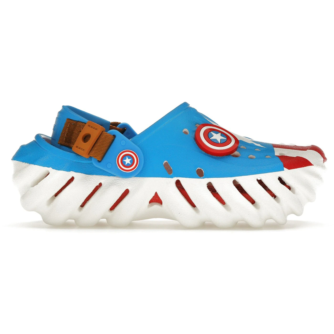 The Crocs Echo Clog Marvel Captain America Steve Rogers (Kids) features a Blue/Red/White colorway. This Crocs Echo Clog was first released for $75 on June 11, 2024.
