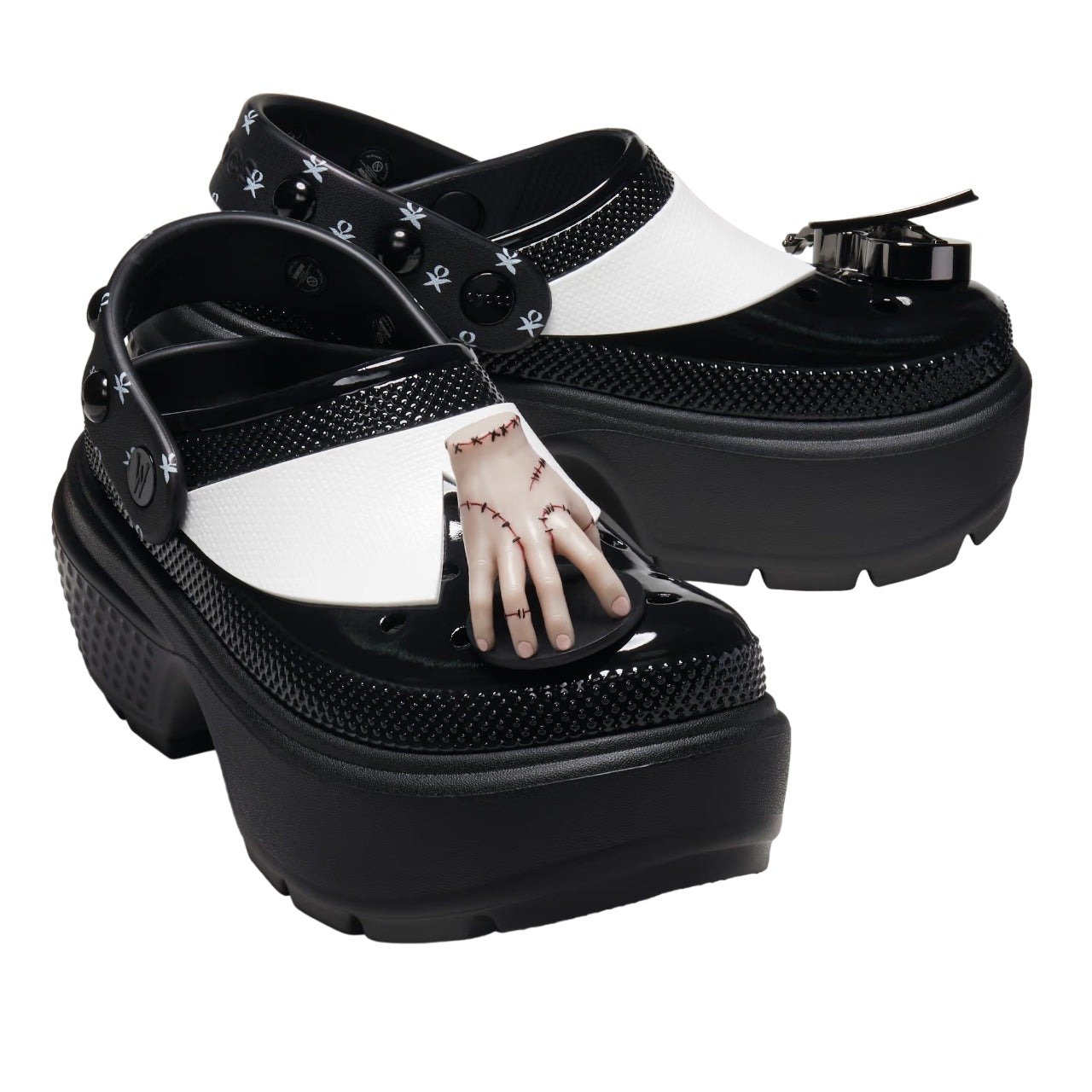 The Crocs Stomp Clog Wednesday Addams features a Black/White colorway. This Crocs Stomp Clog was first released for $90 on September 30, 2024.