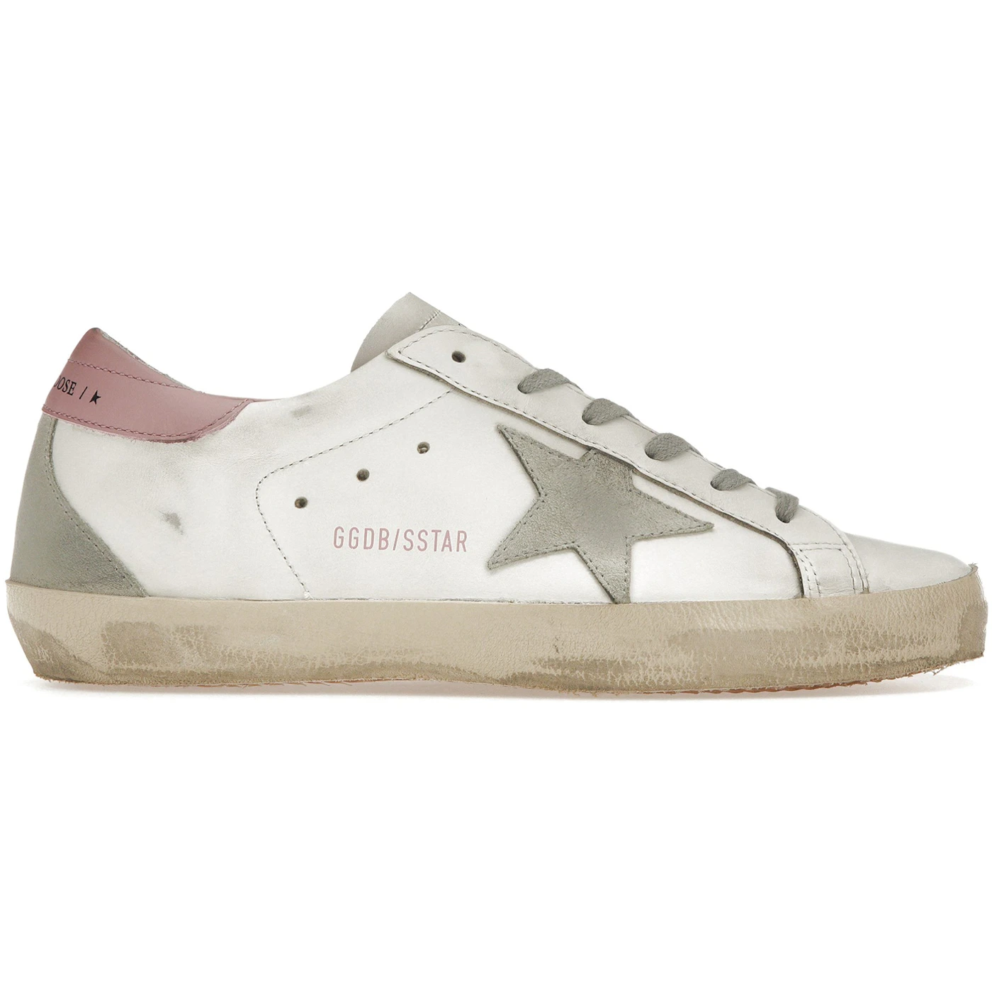 The Golden Goose Super-Star White Light Pink (Women’s) celebrates imperfections and conveys a nonchalant attitude in a high fashion pair of kicks. This shoe is specifically sized for women.The upper of this low-riding sneaker is fashioned from white leather, sporting diagonal perforations on the lateral side panel and horizontal perforations on the medial, facilitating ventilation and enhancing comfort. The lateral side panel also sports a gray suede star and pink branding. Gray suede also forms the heel tab and matches the gray laces. The sole unit features vintage off-white side walls and a gum rubber outsole with an iconic herringbone traction pattern. Super-Star signature scuff marks hit not only the upper, but also the midsole.Our favorite aspect on this pair of women’s sneakers is the heel tab crafted in pink leather and featuring metallic Golden Goose Super-Star branding. The Golden Goose Super-Star White Light Pink (Women’s) was released on January 1, 2024, for a retail price of $495.