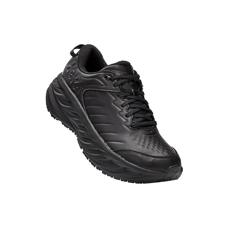 The Hoka One One Bondi SR Black is a low-top silhouette with a slip-resistant outsole in an all-black colorway that has been designed for the demands of people in the medical and service industries, among others. The Hoka One One Bondi SRs upper is water-resistant and made out of full-grain leather, while the non-marking outsole is oil and slip-resistant with a unique tread to optimize traction. As for cushioning, a full-length EVA midsole eases impact while a padded memory foam collar and a soft lining wrap on the tongue are added pluses. This sneaker is completely black with the exception of an orange element on the outsole and Hoka branding on the insole. The best feature of the Hoka One One Bondi SR Black has to be its focus on workplace readiness. The slip-resistant, cushioned design is tailored for people who spend long hours on their feet in demanding environments. Originally retailed for $170, this shoe was launched on August 3, 2021.