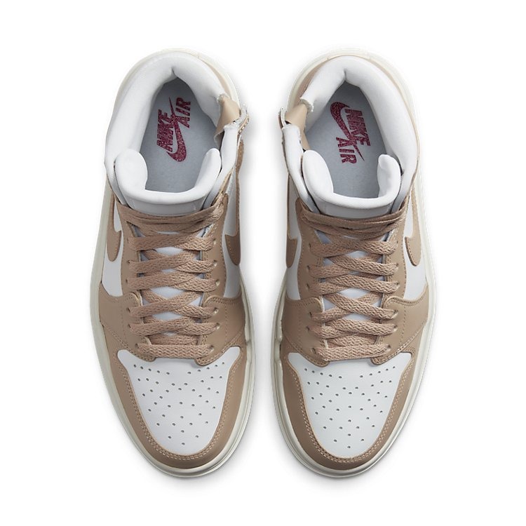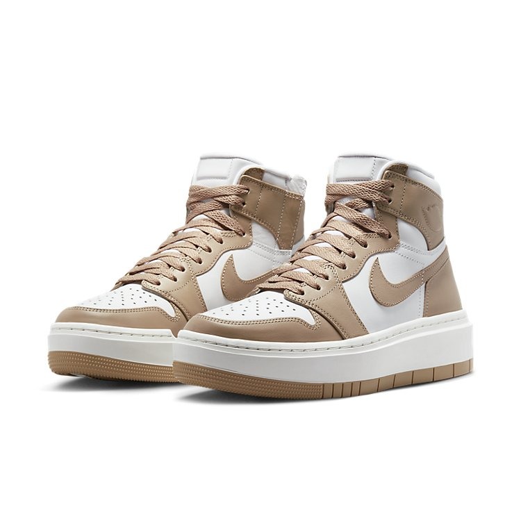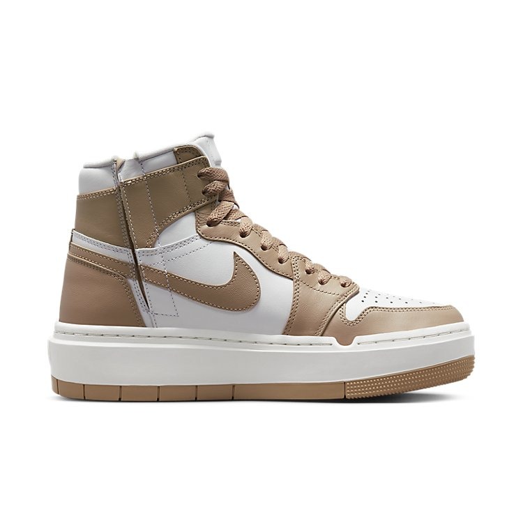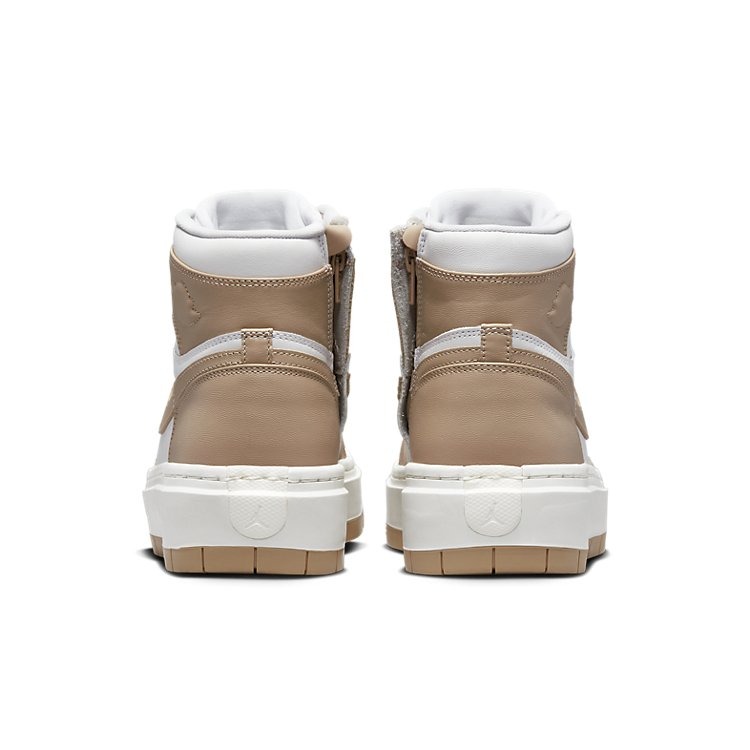 The Jordan 1 Elevate High White Desert (Women’s) takes a classic high-top silhouette, dresses it in a subtle colorway, and shakes up the design with some singular details. The Jordan 1 Elevate High-Top for women in a White / Desert – Sail colorway features a tumbled white leather upper with desert-colored tumbled leather overlays that match the tumbled leather quarter panel Nike swoosh and the laces. White also appears on the tongue, sock liner, and insole with Nike Air branding. The sail-colored platform foam midsole encapsulates Air for higher elevation. What we appreciate most about this sneaker are the details that deviate from the classic design. The Wings logo on the lateral collar is a puffy outline, the medial side panel features a vertical zip closure, the toe box overlay and sidewall feature crescent indentations, and the rubber outsole is two-toned, with desert-colored traction surrounding a pod of white. The Jordan 1 Elevate High White Desert (Women’s), was released on February 13, 2023 for a retail price of $145.
