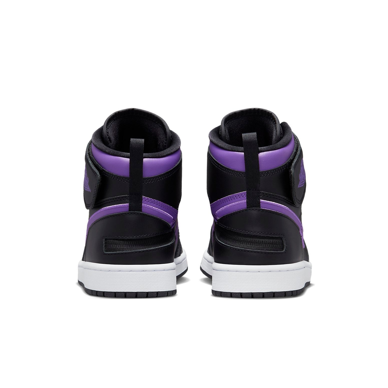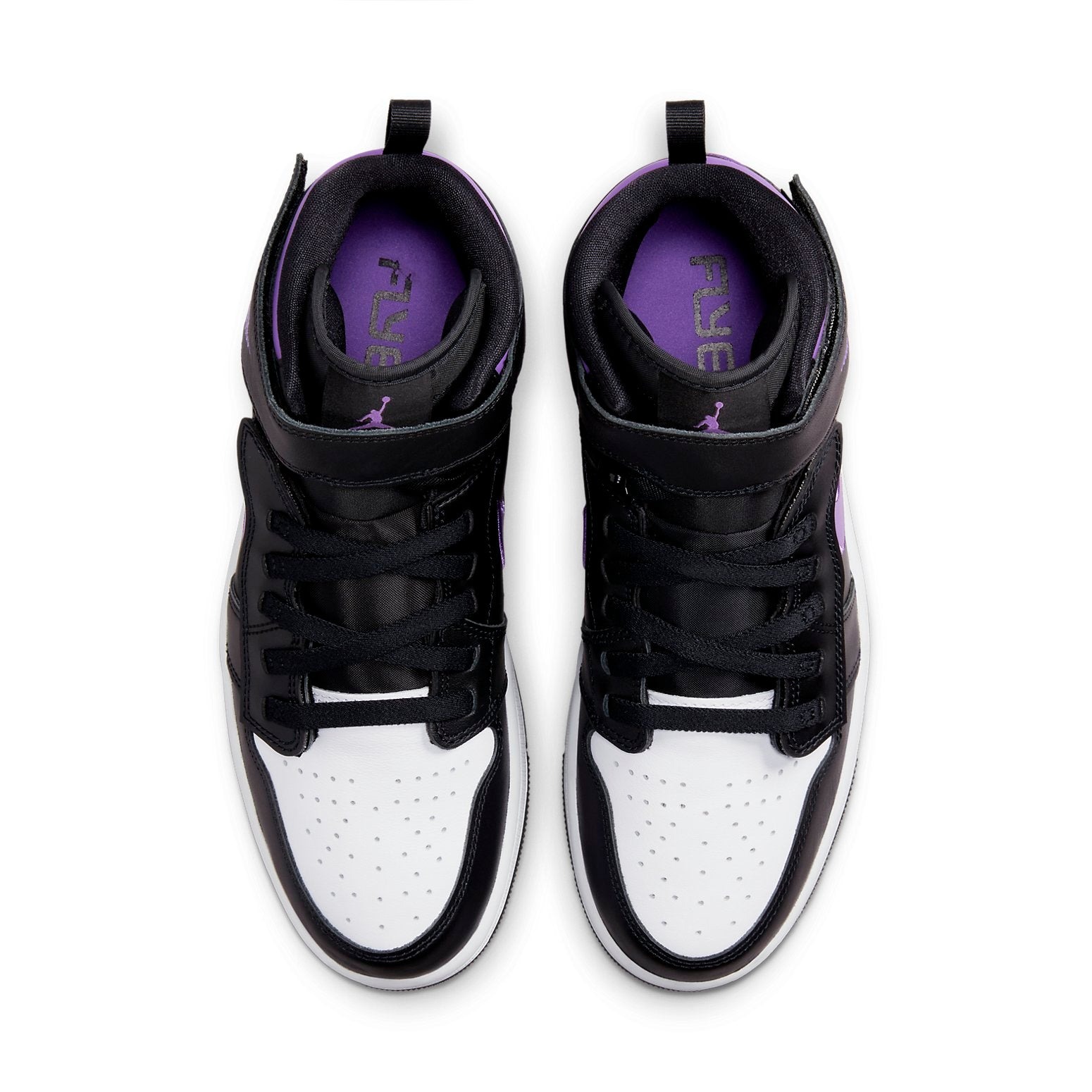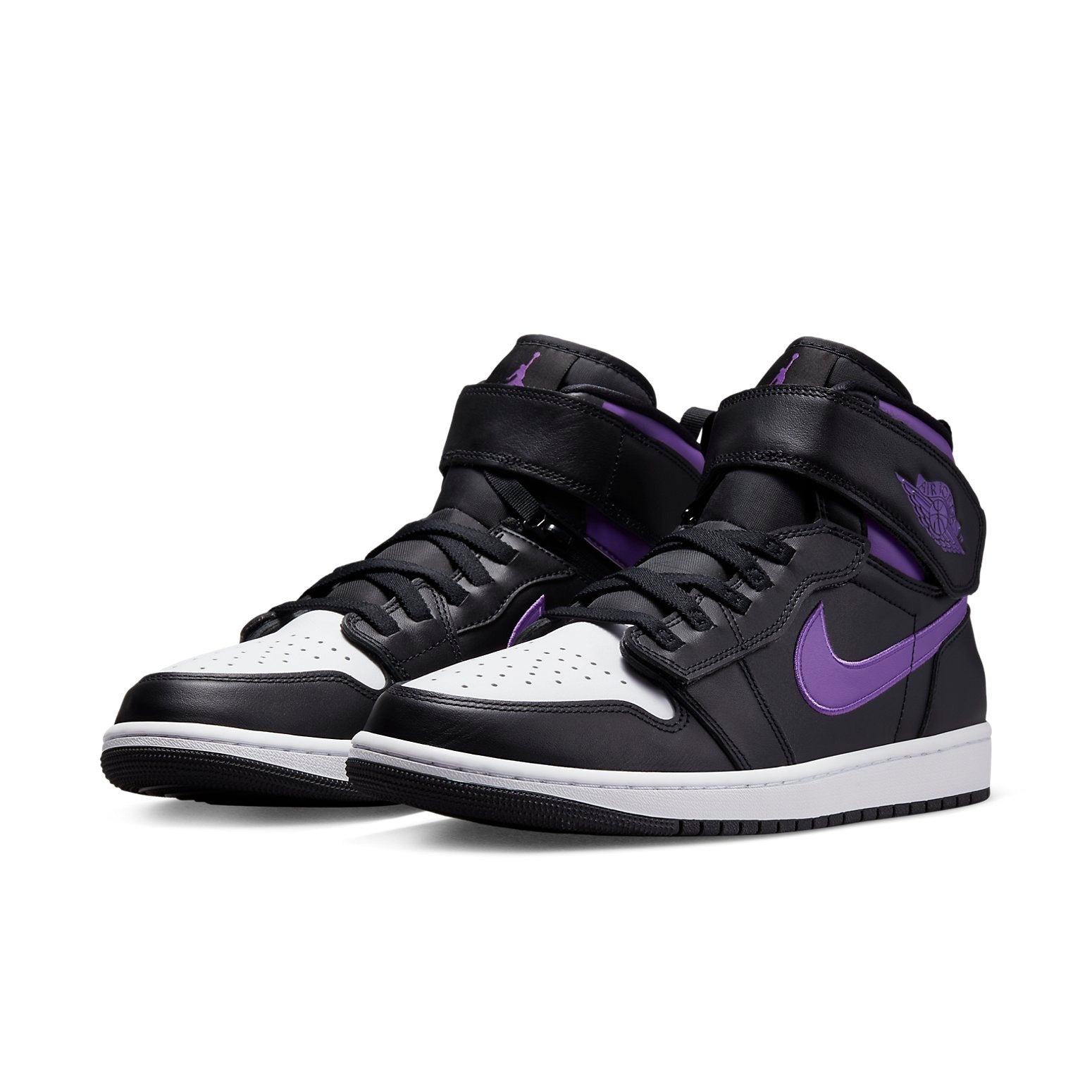 The Jordan 1 High FlyEase Black Bright Violet is an offering from the Jordan 1 High FlyEase line in a black and Bright Violet colorway.This high-top Jordan 1 FlyEase sneaker features a leather upper dressed in white on the toebox and black on the forefoot, mid-panel, eyestays, heel, and ankle strap. Violet accents on the Swooshes, ankle collar, the Jumpman logo on the tongue tag, and the “Wings” emblem on the ankle strap contrast the upper. A Velcro closure lacing system and Tobie Hatfield s FlyEase technology, comprising a medial zipper and several hook-and-loop adjustments, offer a personalized fit. Other details include an elongated heel pull tab, black laces, synthetic tongue, mesh lining, and purple insoles with “FlyEase” branding. A white midsole atop a black rubber outsole completes the design. Something we love about this AJ1 is its unique lacing technology, which guarantees a comfortable fit and ease of entry. The Jordan 1 High FlyEase Black Bright Violet was released on December 10th, 2022, retailing at $140.