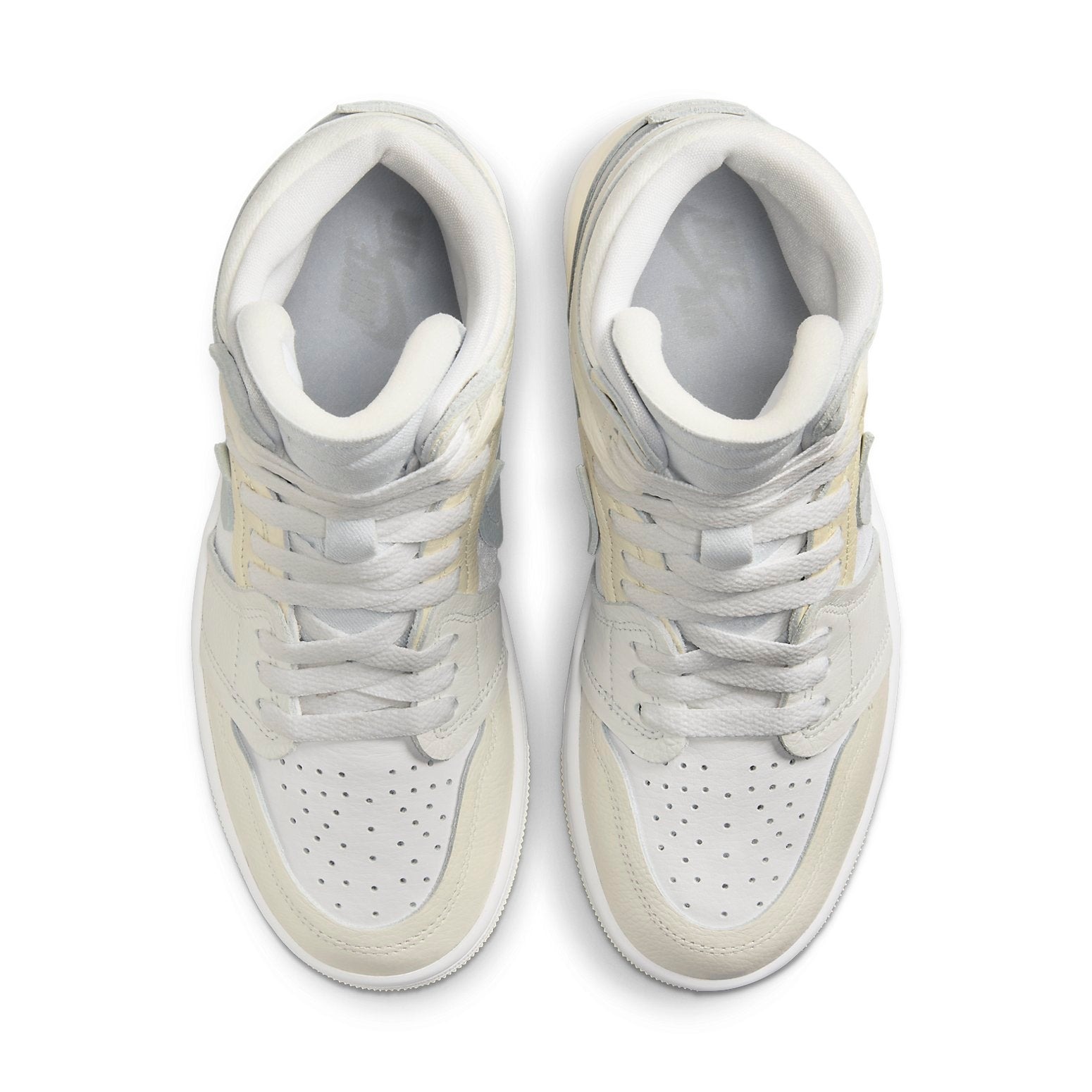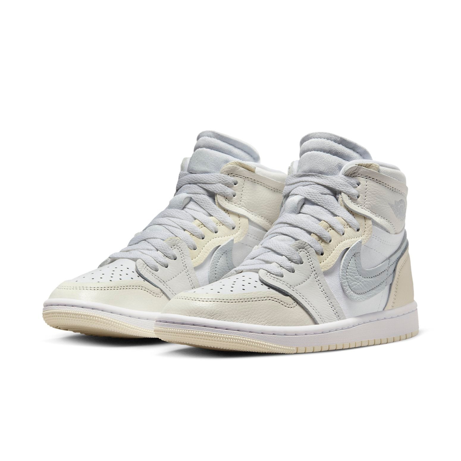 The Jordan 1 High MM Coconut Milk (Women’s) features different textures arranged in a prominent layered look that lends distinction to this classic silhouette specifically sized for women.The Women’s Jordan 1 Multi Material High-Top in a Coconut Milk colorway sports an upper with a base of white canvas on the side panels and perforated white tumbled leather on the toebox. White tumbled leather overlays the vamp, Sail tumbled leather overlays the toebox and collar, and Coconut Milk tumbled leather overlays the eyestays and heel counter. White laces match the white canvas tongue with its white exposed foam. A white foam midsole encapsulates Air and sits atop a Coconut Milk rubber outsole with circles, grooves, and stars designed for impact absorption and traction.What we enjoy most about this sneaker is the way the branding enhances the aesthetic. An oversized platinum tumbled leather Nike Swoosh courses across the side panel, while a platinum Wings logo accents the collar. Ghostly Nike branding appears on the insole and embossed Nike branding adorns the outsole. The Jordan 1 High MM Coconut Milk (Women’s) was released on October 4th, 2023, for $155 retail.