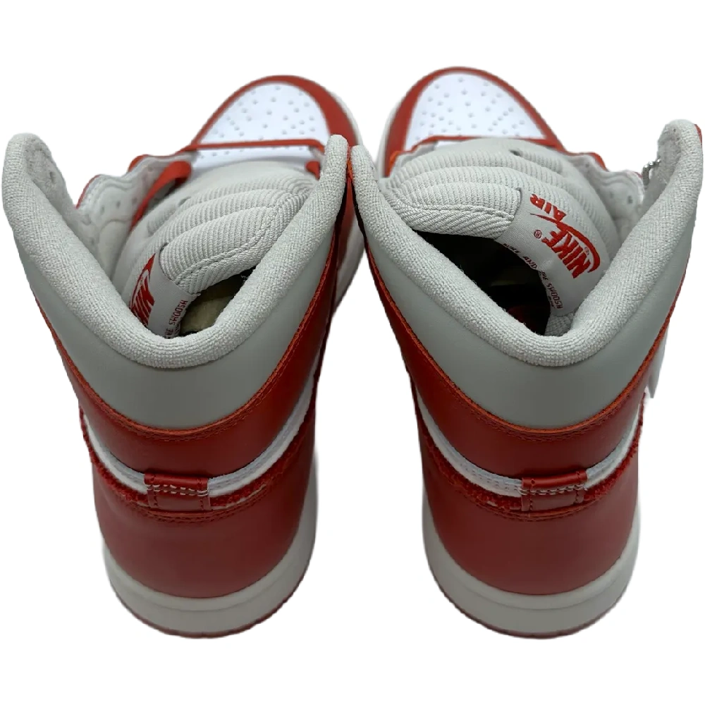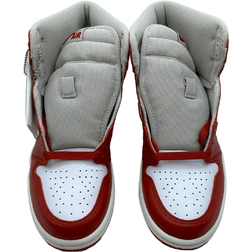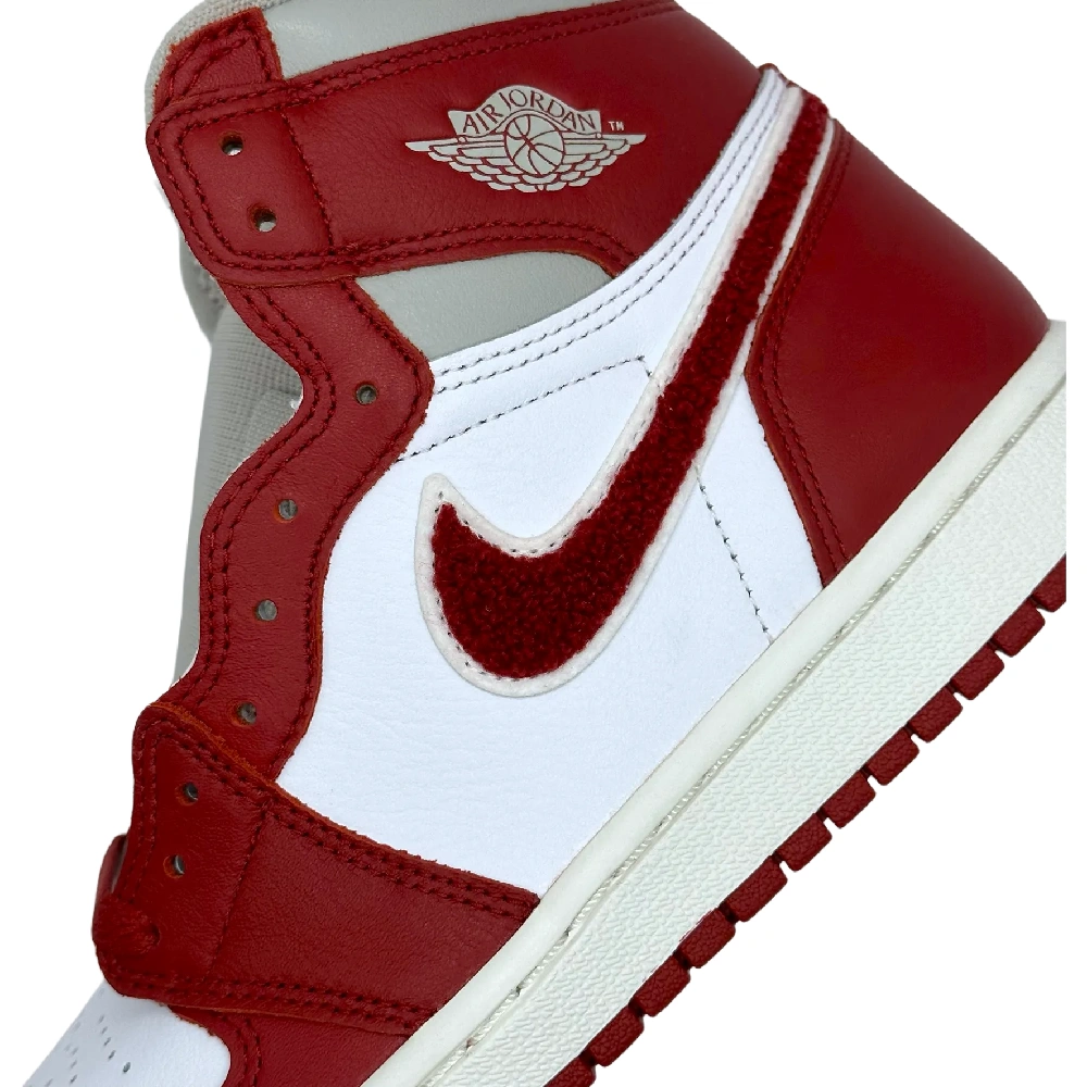 The Air Jordan 1 High Varsity Red (W), often known as the Jordan 1 Newstalgia due to its retro design, has a white smooth leather upper with red leather overlays, light grey collars, and matching chenille Swooshes. The design is then finished off with woven iconic Nike tongue tags, a corduroy-fabricated tongue, and a Jordan Wings emblem on top of the hue.