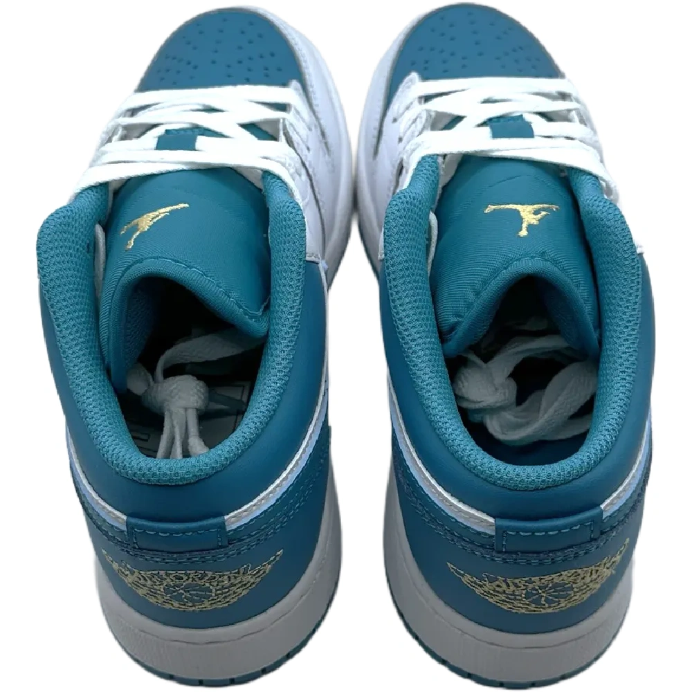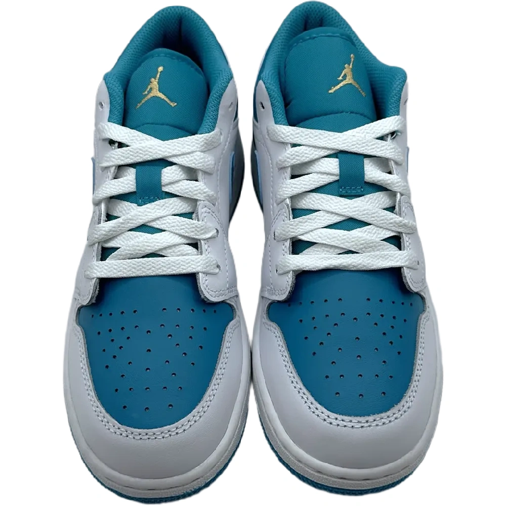 The Jordan 1 Low Aquatone (GS) features a White/Celestial Gold-Aquatone colorway. This Jordan 1 Low was first released for $95 on April 01, 2023.