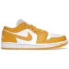 The Air Jordan 1 Low Pollen is a low-top model of the signature Air Jordan 1 shoe with a Yellow and Pollen color scheme. Pollen is the most prominent of its two colors. It appears on the shoe s swooshes, mid-foot, laces, collars, overlays on the forefoot and heels, and interior liners. It also appears on the shoe s Jumpman branding. The lesser prominent of its two colors, white, appears on the shoe s toe boxes, quarters, and the ball-and-wings emblems embroidered into its heels. A pollen rubber outsole and white midsole hold this shoe s upper together.The Air Jordan 1 Low Pollen was released in 2021. Originally, it retailed at $100.