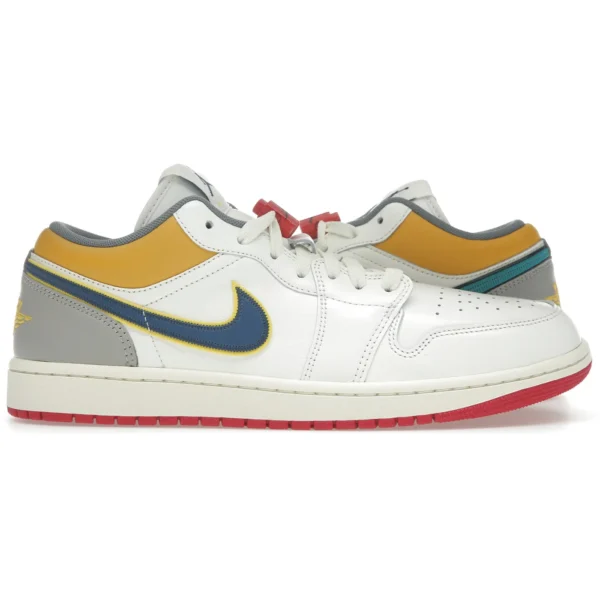The Jordan 1 Low PRM Sail Cashmere dresses the iconic Air Jordan 1 Low silhouette in a neutral Sail and Cashmere colorway with mismatched accents in blue, yellow, and College Grey. Originally designed as a low-top basketball shoe, this version of the AJ 1 low features a premium leather construction with the base, overlays, and eyelets all crafted from the same material. This low-top sneaker, featuring AIR capsules in the soles, also boasts another noteworthy element: plastic lace locks attached to the laces. Borrowed from the Air Jordan 5 and 6, these lace toggles secure the fit and add a pop of red that matches the rubber outsole. Our experts at Newsole appreciate the contrasting colors on the Swoosh logos. For instance, the left shoe showcases a teal and black Swoosh, while the right shoe has a white and blue Swoosh. The Jordan 1 Low PRM Sail Cashmere was released on February 1, 2025, and sold for $155.