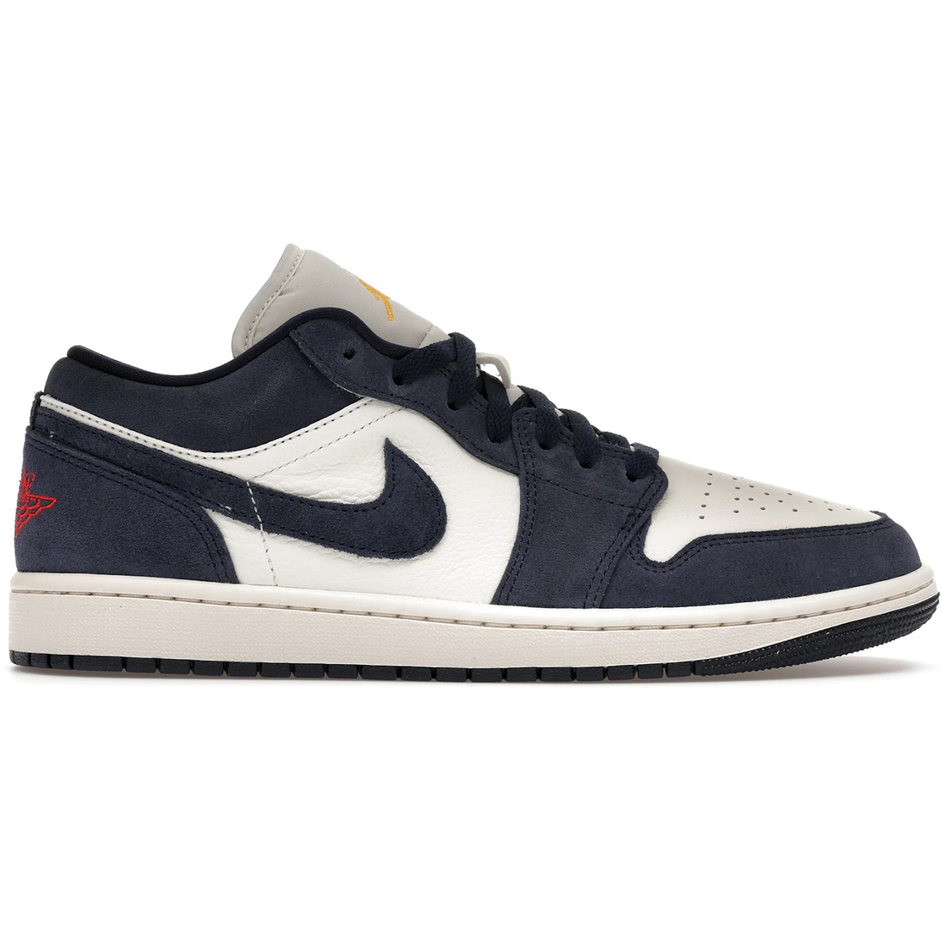 The Jordan 1 Low SE Obsidian Suede features a Obsidian/University Gold/Chile Red/Obsidian colorway. This Jordan 1 Low SE was first released for $130 on March 01, 2026.