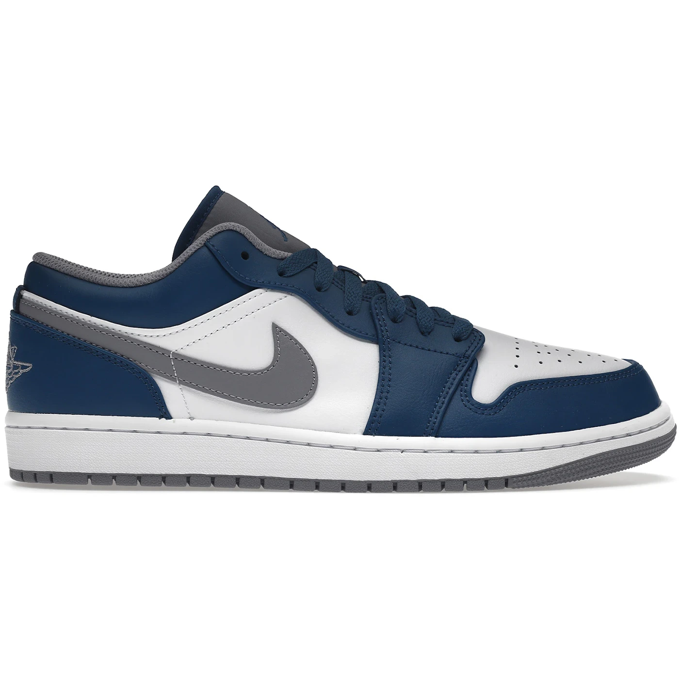 The Air Jordan 1 Low True Blue comes in true blue, cement grey, and white colorway.The main materials used to make this Low Air Jordan 1 are leather and rubber. The upper of the shoe is made of blue and white leather. It has a perforated white toe cap, blue cotton laces, and an underlying grey tongue. The rubber outsole and stitched midsole have encapsulated AIR units for cushioning. It also has Swoosh emblems on its laterals and a Jumpman on the heel section.The Air Jordan 1 Low True Blue was originally released on January 17th, 2023, with a retail price set at $110.