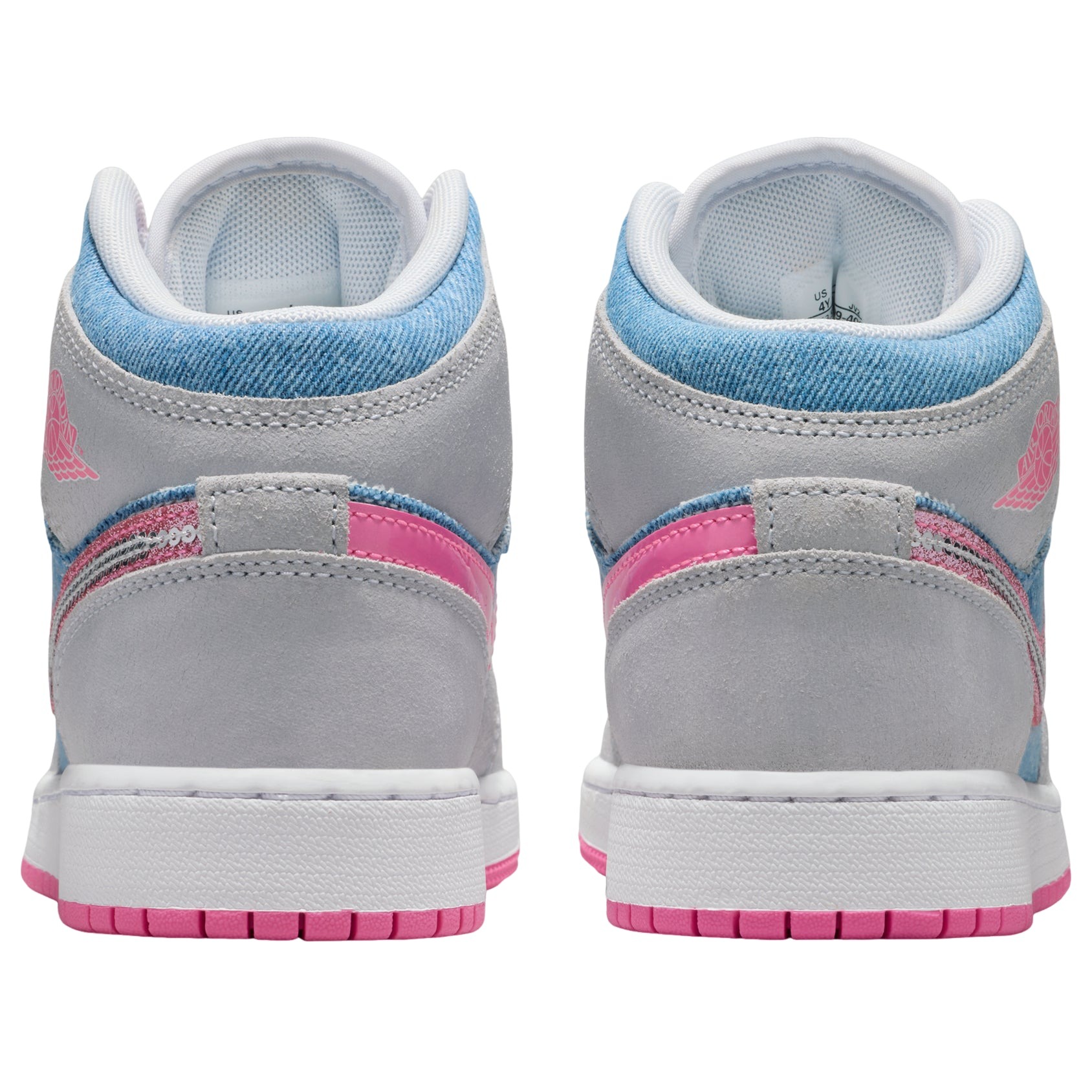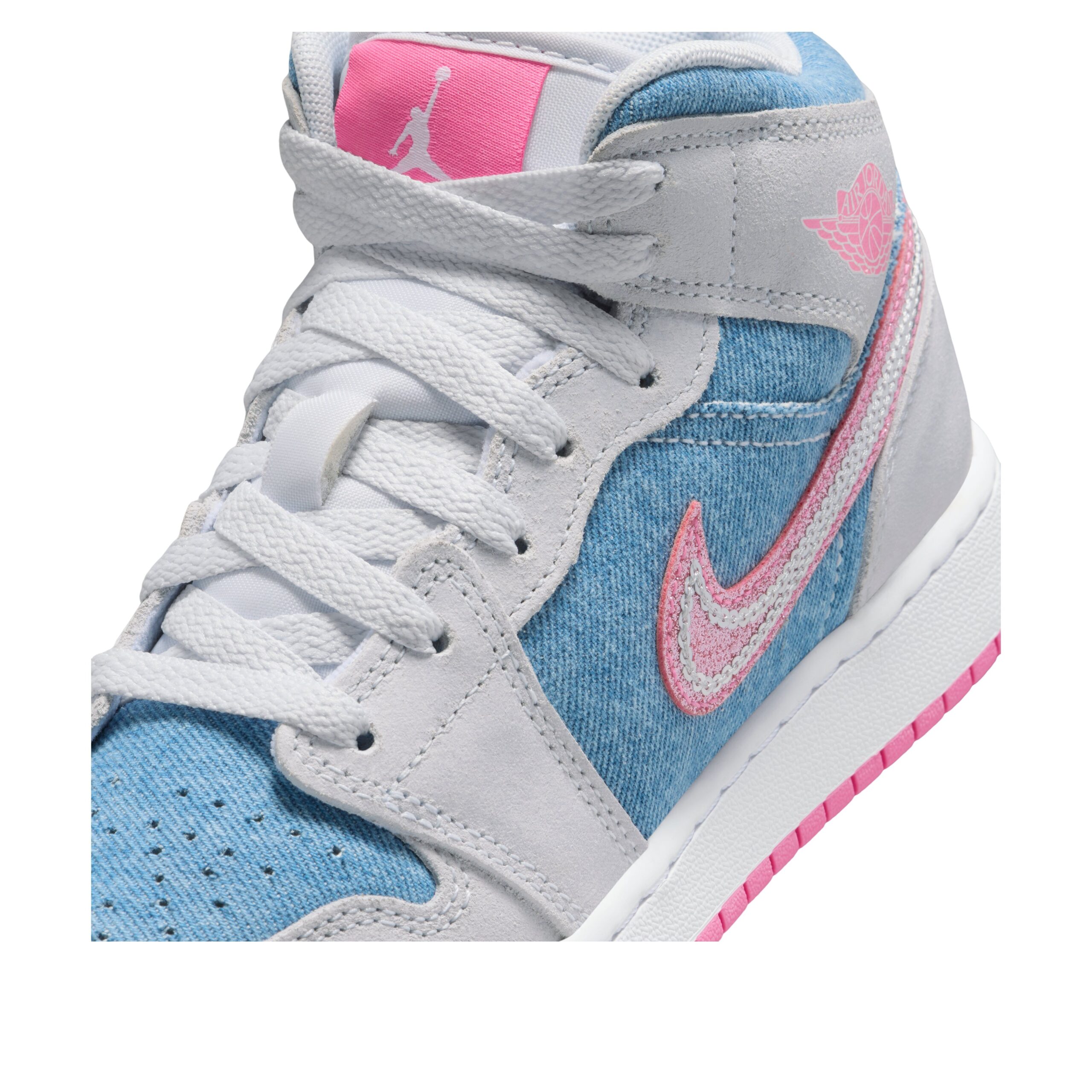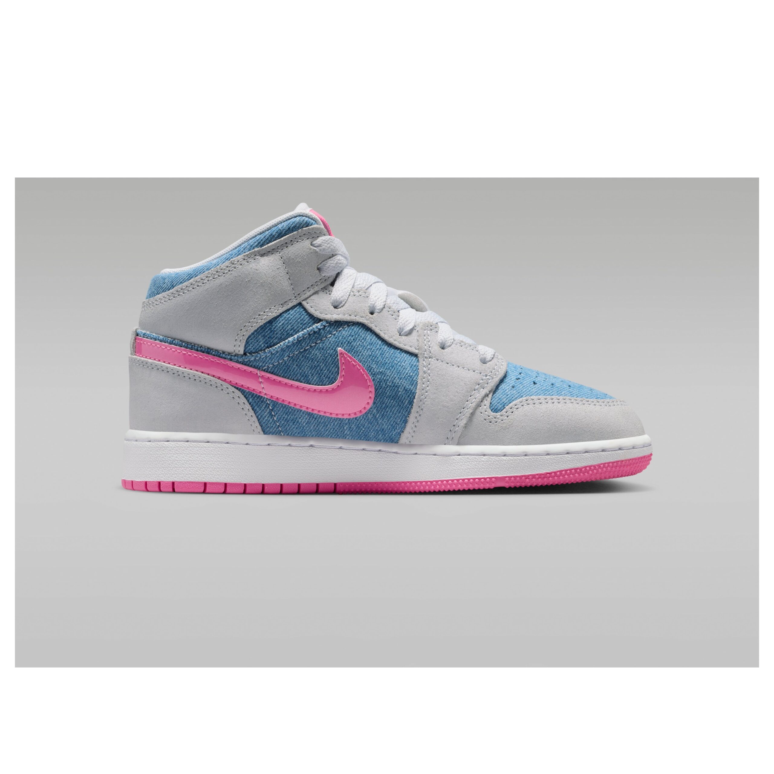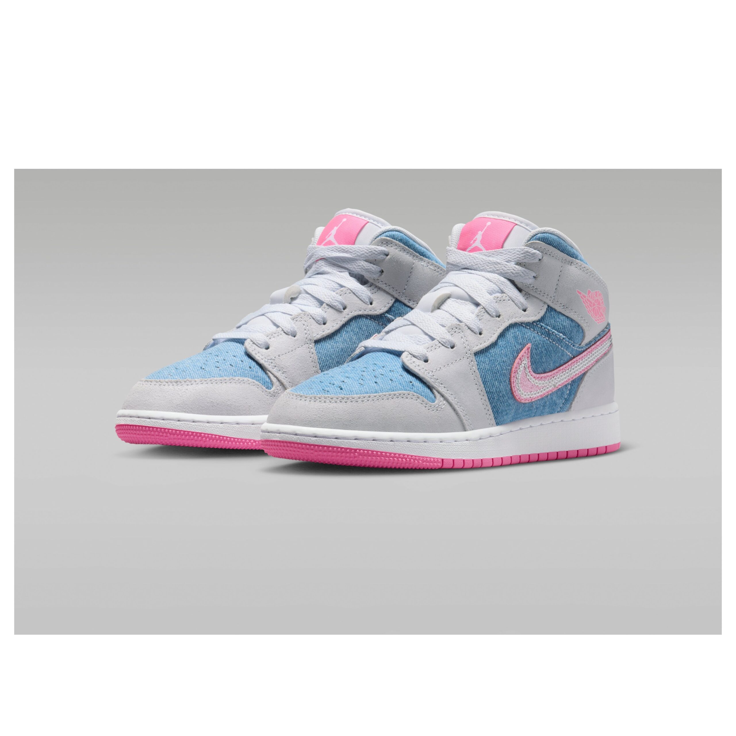 The Jordan 1 Mid Denim Sequin (GS) features a Cobalt Bliss/White/Pink Glow colorway. This Jordan 1 Mid was first released for $120 on August 01, 2025.