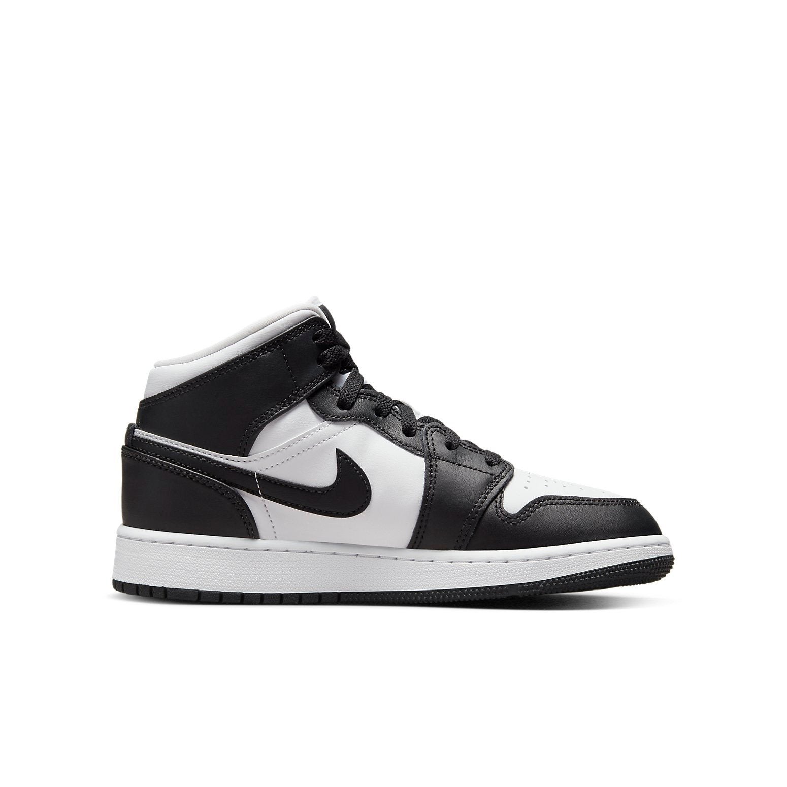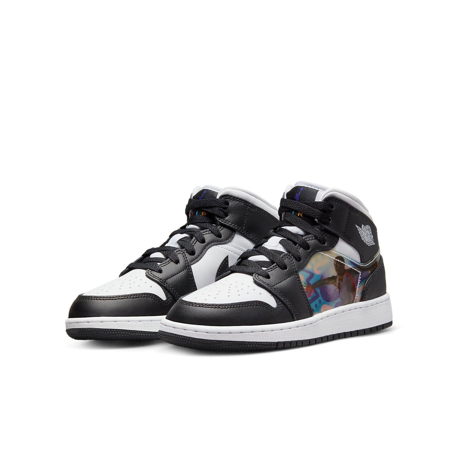 The Jordan 1 Mid Hologram (GS) is a sneaker specifically sized for grade school-aged kids. This iconic silhouette pops with its distinctive upper. The Grade Schoolers Hologram version of the Jordan 1 Mid-Top features a classic colorway and signature attributes. An upper base of white leather has perforations on the toe box for increased airflow. The white mesh tongue matches the padded sock liner and the Jumpman logo on the black insole. The leather overlays of the upper are black, as are the laces and the grooved rubber outsole. The foam midsole contains air for added cushioning. The Wings logo on the collar is the final hit of white, and the Jumpman logo on the tongue tag provides a hit of purple.The most interesting and eye-catching aspect of this kids sneaker is the lateral quarter panel overlay that portrays shifting images of MJ himself. The Jordan 1 Mid Hologram (GS) was released on September 14, 2022, for $110 retail.