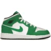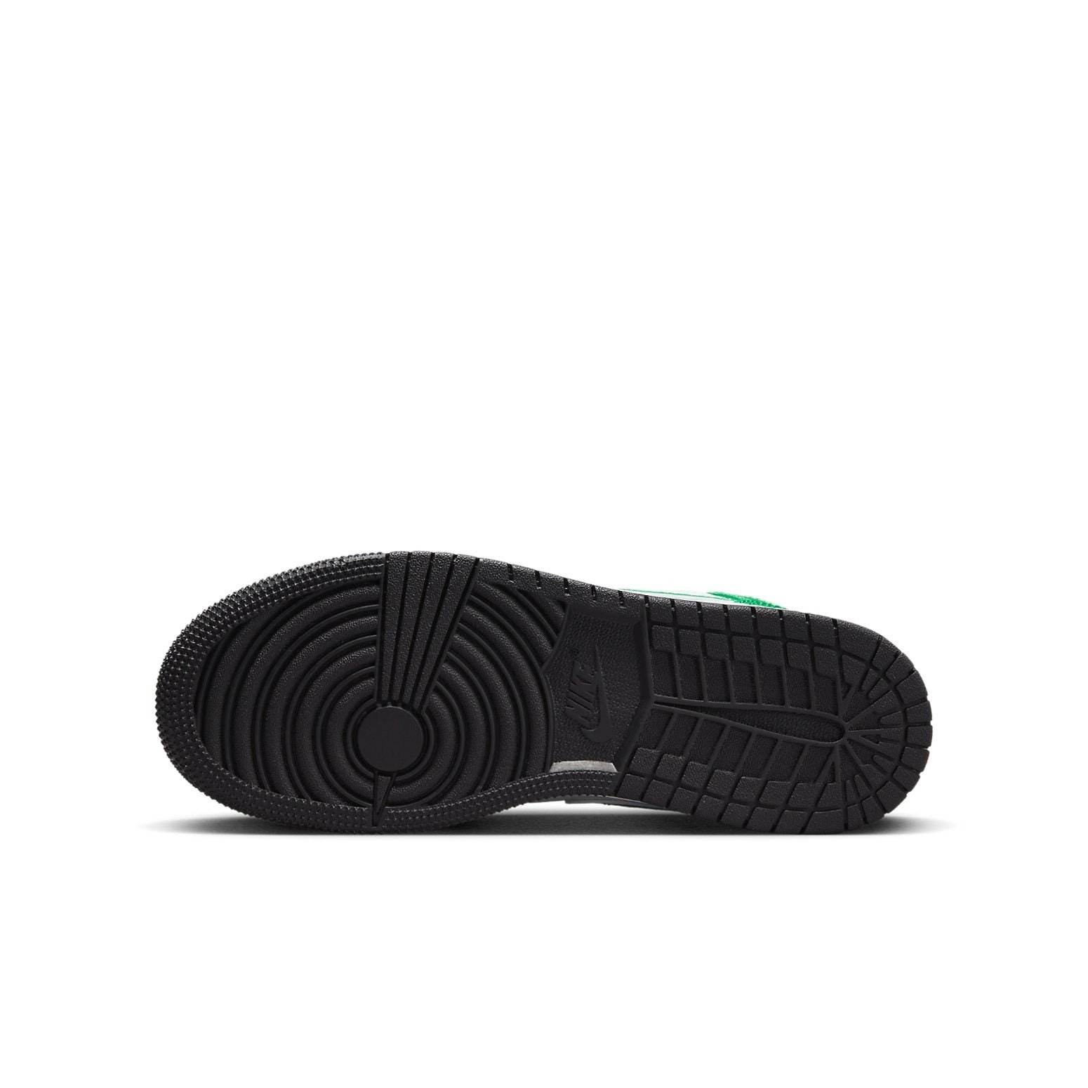 The Jordan 1 Mid Lucky Green (GS) was released in grade-school sizing as part of the Air Jordan Mid collection. The Lucky Green Air Jordan 1 Mid GS has a mid-top silhouette and a perforated toe box which provides breathability. The Nike Swoosh is on both sides, while the Air Jordan Wings logo is visible on the side of the collar. The shoe has a padded tongue and collar that offer both comfort and support. The outsole features flex grooves, which allow for natural foot movement and flexibility, while the midsole is made of EVA, a foam-like material that provides cushioning and support. We think that the outstanding feature of the Jordan 1 Mid Lucky Green (GS) is its colorway. The mixture of white, Lucky Green and black gives the shoe a fresh, modern look. The shoe was released on March 1st, 2023 at a retail price of $110.