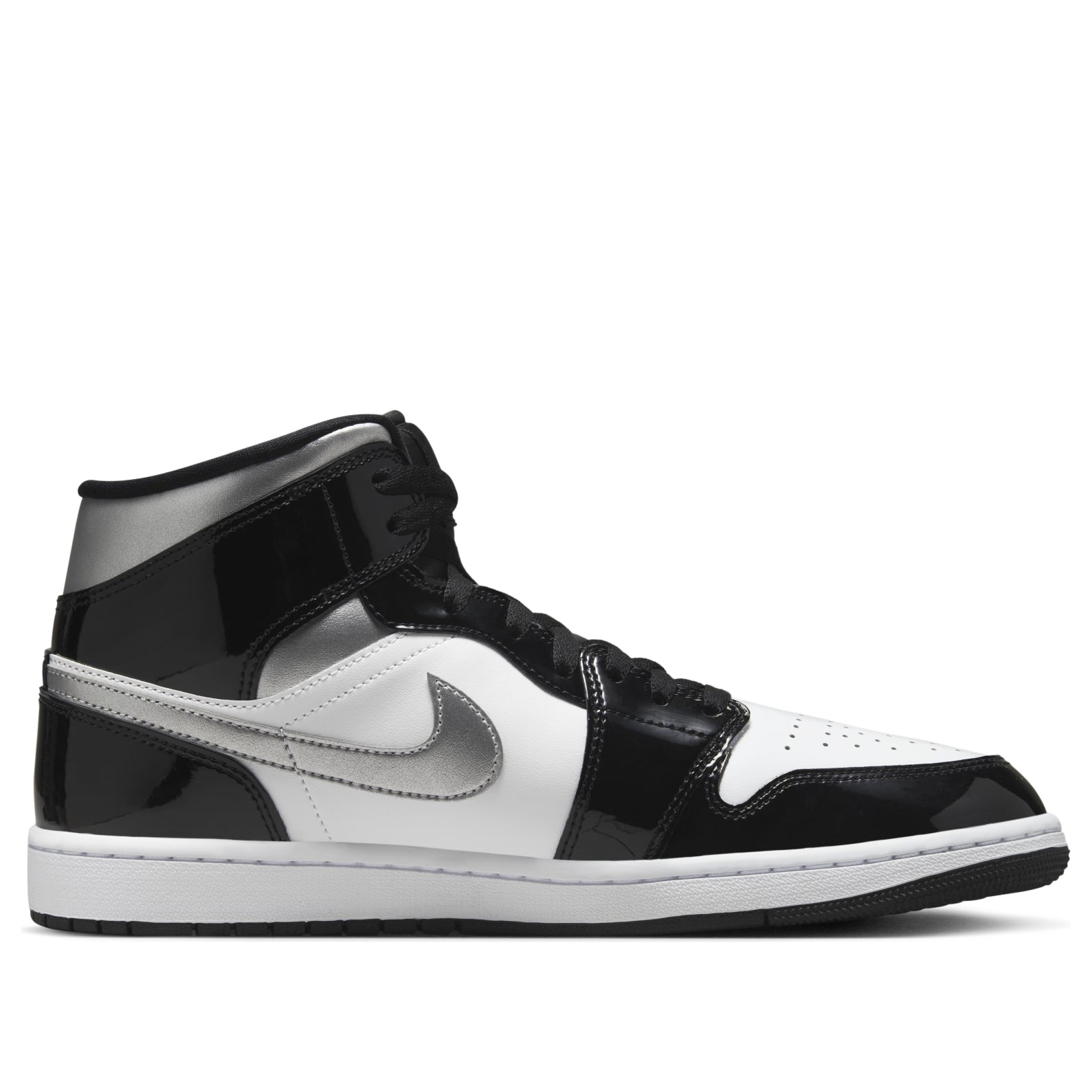 The Jordan 1 Mid SE Patent Black White Metallic Silver Metallic Gold is a special-edition, mid-top profile from the Jordan 1 line with a luxurious Black, White, Metallic Gold, and Metallic Silver color palette. This shoe channels a premium aesthetic with its showstopping glossy patent accents and Metallic Silver and Gold elements. Shiny Black patent overlays adorn the toe cap, flow up to form the eyestay, and then wrap around the signature high ankle and down to the heel cap. This is balanced out with a perforated White toe box and White side panels. Metallic Silver gets into the action on the side Swooshes and high ankle collar, while iconic Metallic Gold Wings are on the lateral ankle. We love the silver Jumpman and Gold Air branding on the tongue, which completes this colorway s luxe feel. When it hit the shelves on October 20, 2024, the Jordan 1 Mid SE Patent Black White Metallic Silver Metallic Gold retailed for $135.