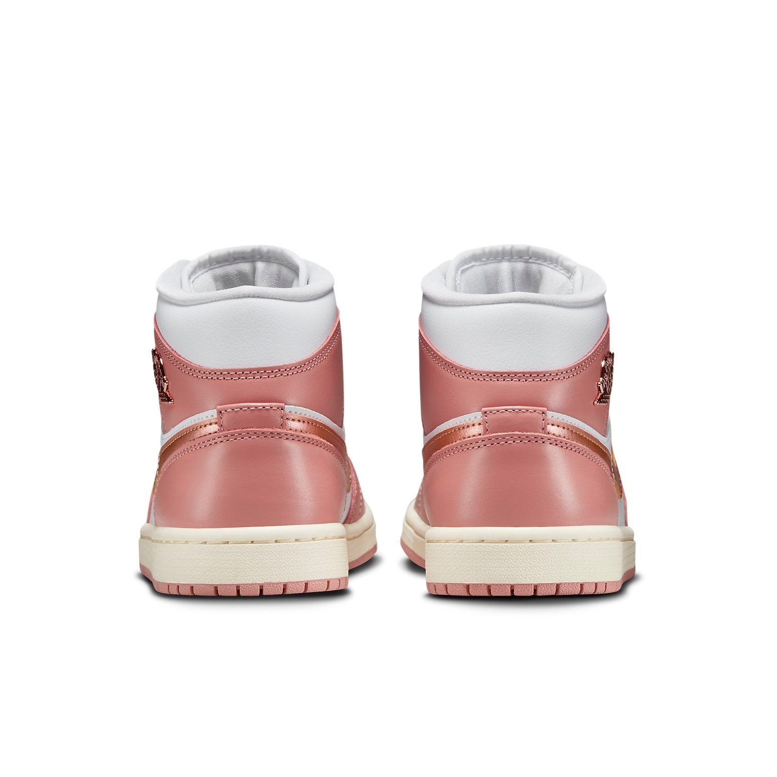 The Jordan 1 Mid SE Red Stardust (Women’s) presents a classic hoops silhouette, dresses it in a soft colorway, adds a bit of shine, and sizes it for women.The Women’s Air Jordan 1 Mid-Top Special Edition in a red stardust/white/sail/metallic copper colorway starts with an upper base of white tumbled leather. Tumbled leather overlays in a dusty rose hue adorn the toe, midfoot, eyestays, collar, and heel. Dusty rose laces cross over a white tongue with a dusty rose tongue tag that features white Air branding and a Jumpman logo. A white padded collar and sock liner surround a white insole with a dusty rose Jumpman. This upper rests on a sail-colored midsole that encloses air for cushioning. The dusty rose rubber outsole features stars, concentric circles, and grooves that deliver traction and absorb impact.What we enjoy most about this sneaker are the shiny hits on the upper. The side-panel Nike Swoosh is synthetic leather in a shiny coppery hue. A coppery metallic Wings logo adorns the collar and matches the metallic lace dubraes. The Jordan 1 Mid SE Red Stardust (Women’s) debuted on October 18, 2023, for $135 retail.