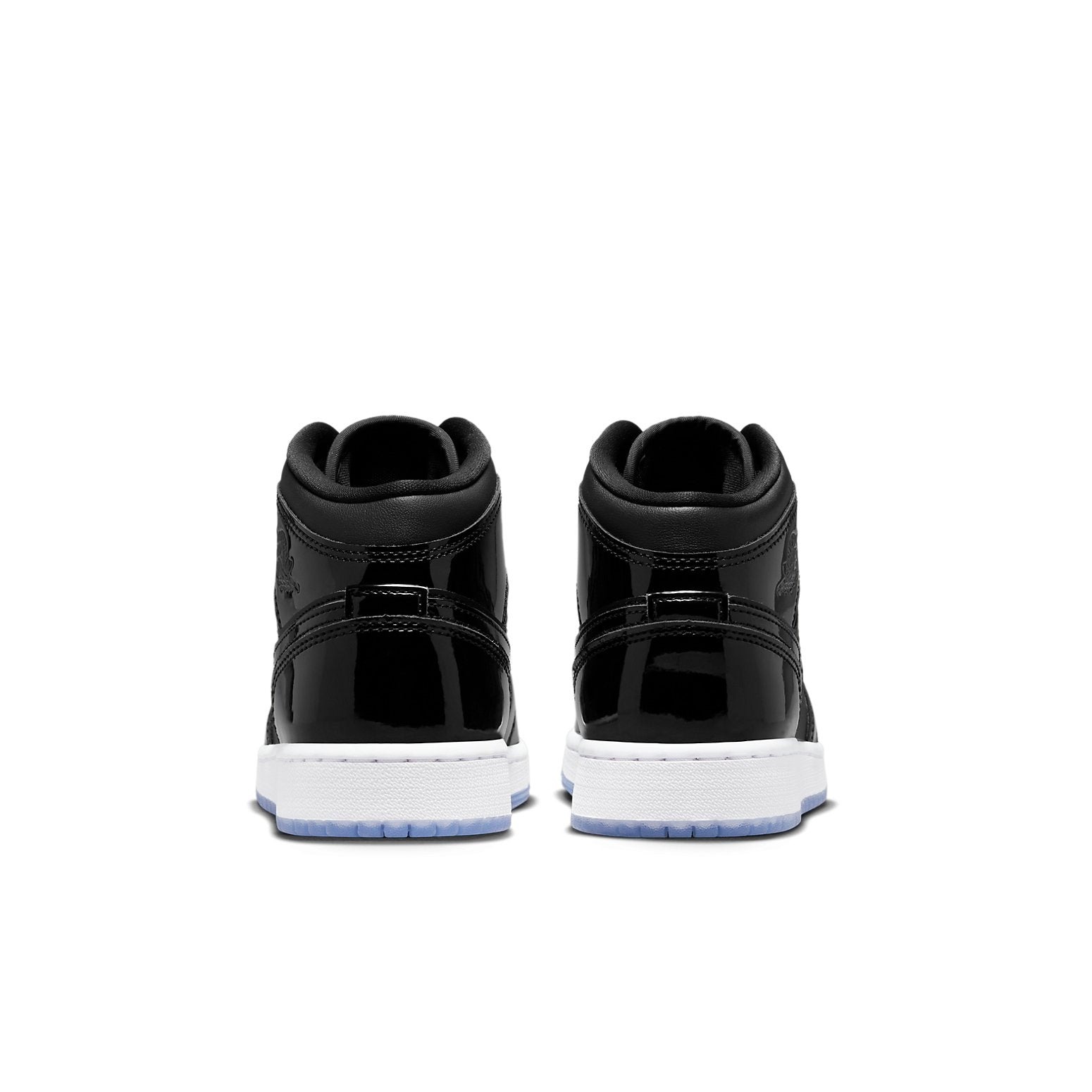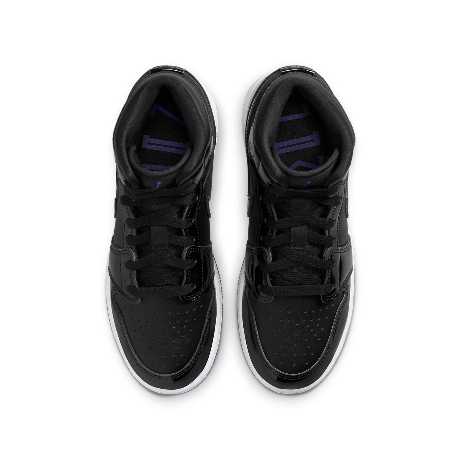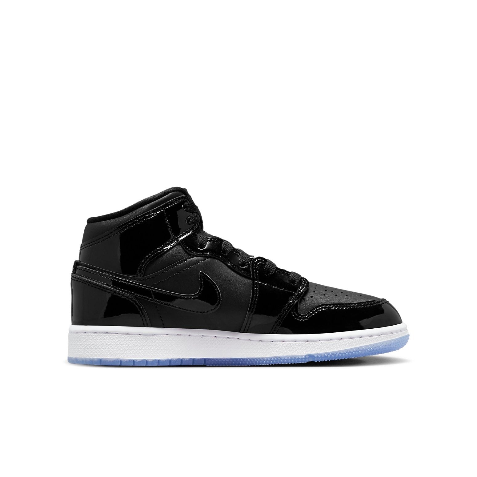 Inspired by the Air Jordan 11 Space Jam, the Air Jordan 1 Mid SE Space Jam (GS) is a mid-top grade-school sizing of the Air Jordan 1 in a Space Jam colorway.This sneaker features an upper made of a smooth Black leather underlay with identical patent leather overlays on the mudguard, eye stays, collar, heel, and Swooshes. Additional details include a tonal Wings logo debossed on the collar, a perforated toe box, Purple Jumpman branding on the Black tongue, and Black flat laces. The upper rests on a White rubber midsole and an Icy Blue see-through rubber outsole.The Air Jordan 1 Mid SE Space Jam (GS) was released on 23rd January 2023 for a retail price of $120.