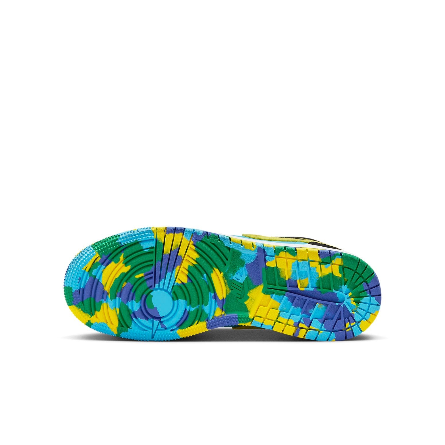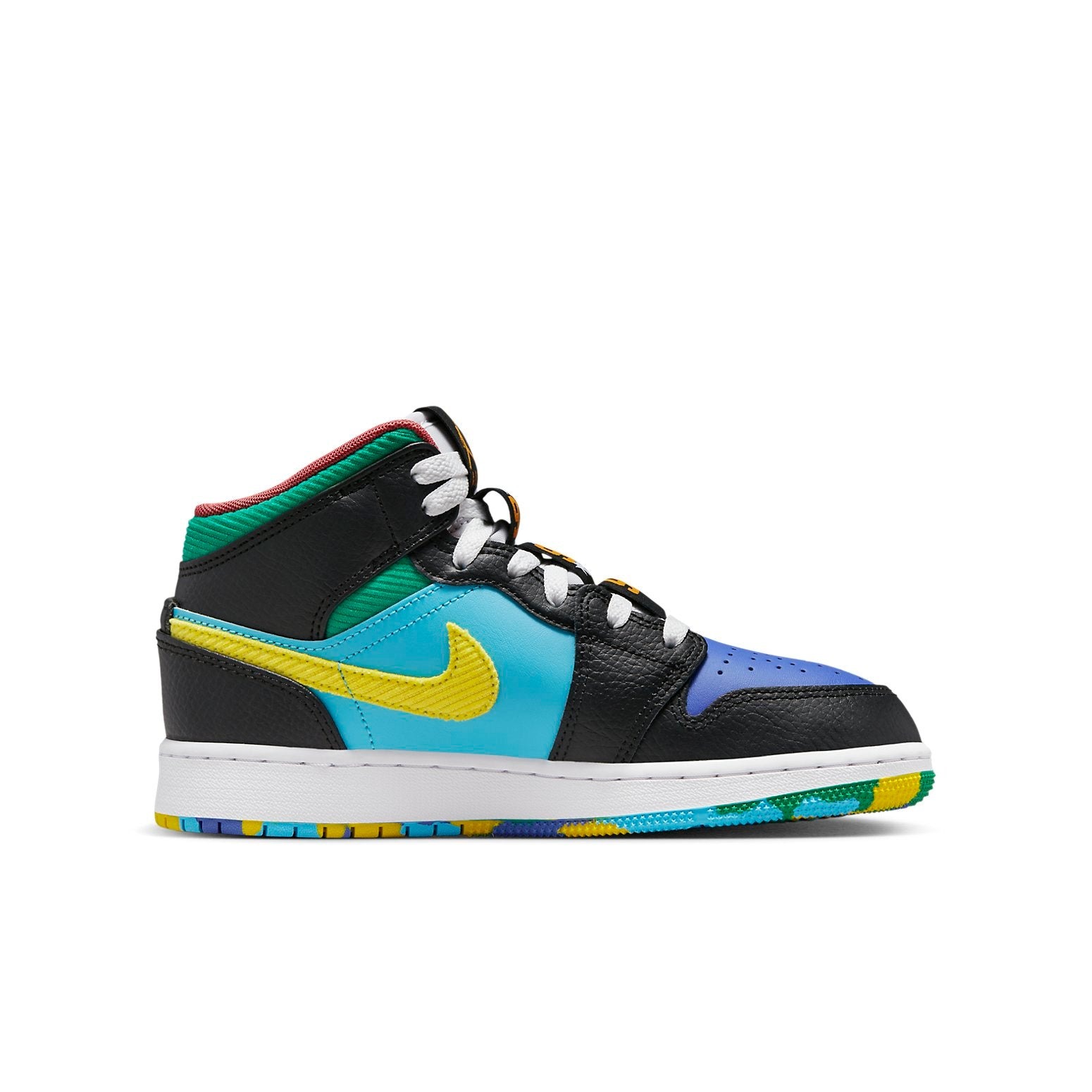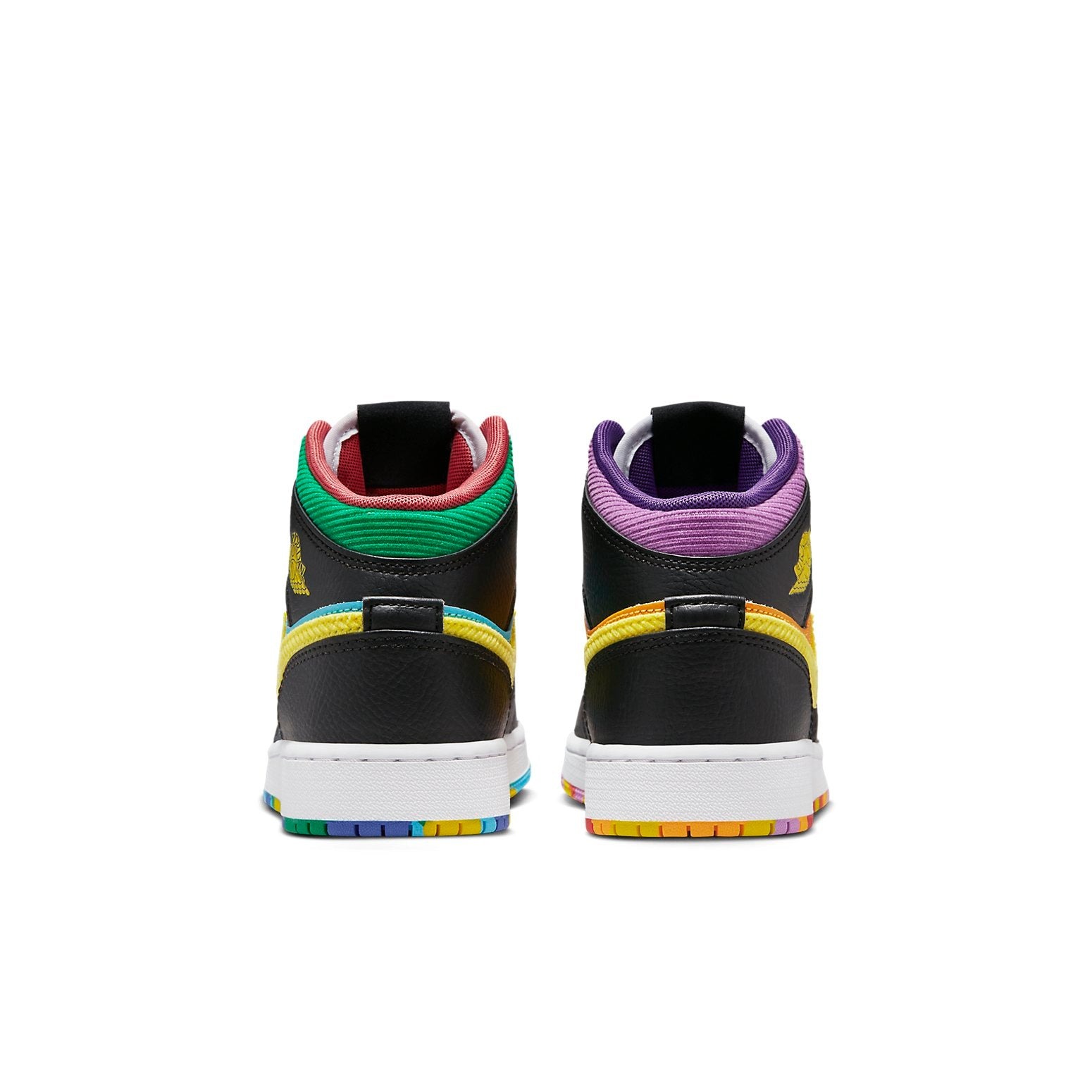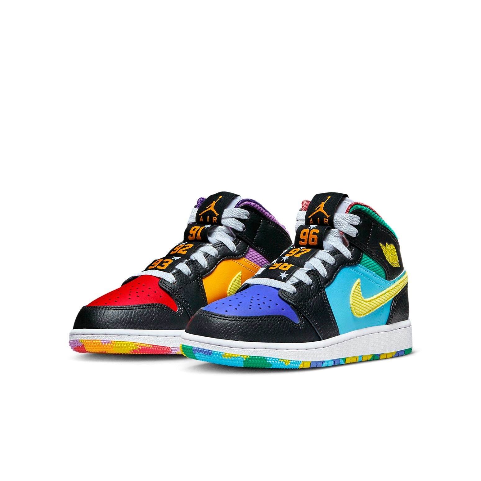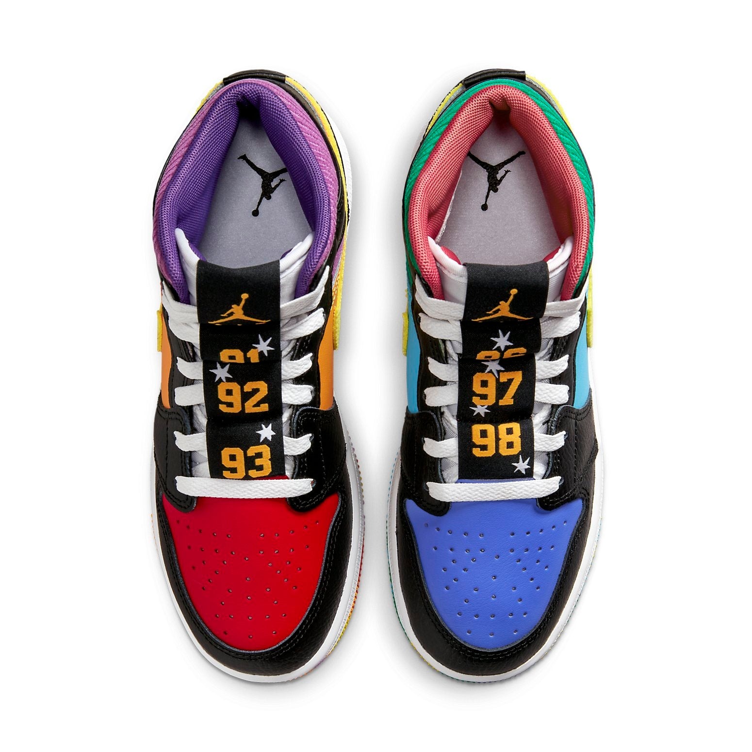 The Jordan 1 Mid SS Six Championships (GS) is a colorful sneaker sized specifically for grade school kids. This eye-catching sports shoe celebrates the six different NBA championships of Michael Jordan.The grade school-sized Air Jordan 1 Mid-Top SS Six Championships has an upper crafted from leathers of different textures as well as corduroy on the side-panel Nike swoosh and collar. These mismatched shoes incorporate the colors of the teams Jordan defeated. The right shoe is red, orange, and purple while the left shoe is blue, light blue, red, and green. Each shoe has black leather overlays and the tongue of each shoe commemorates the years of the championships. The insoles of both shoes are white with the black Jumpman logo. Both shoes also sport a yellow Wings logo on the lateral collar.What our shoe experts enjoy most about this playful sneaker is the sole unit. The classic white foam midsole sits atop a multicolored camouflage-patterned rubber outsole with circles and stars for traction. The Jordan 1 Mid SS Six Championships (GS) was released on November 26, 2023, for $120 retail.